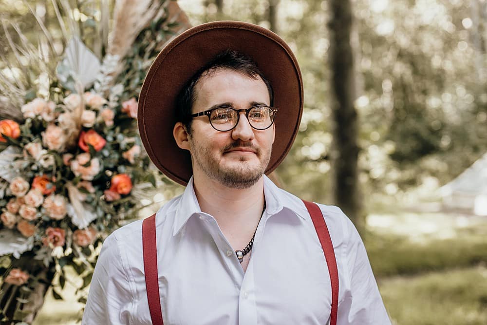 Not forgetting our groom, Tim wore an informal outfit from ASOS, featuring a tan skinny chinos, burgundy braces and topped with a cool camel wide brim pork pie hat. Tim wore his own white shirt and brown boots to complete this true bohemian look.