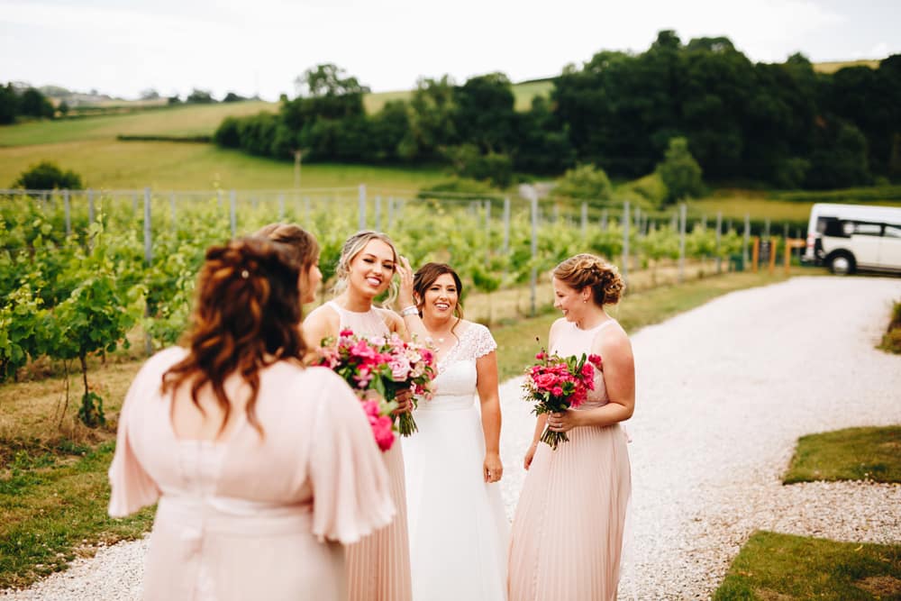 We had 7 bridesmaids, all in the same blush pink dresses brought online from ASOS. They looked great. It was a really easy, we could choose individual styles in the same colour and fabric to suit each bridesmaid. Our hair and makeup teams were from the South West. Lucille and Co blew us away, Harriet was amazing to have with us on our wedding day. Our makeup looked amazing, lasting the whole day. Harriet was calm, lovely to chat to and clearly brilliant at what she does. Kyrell from Devon Wedding Hair created beautiful hair for myself and my bridesmaids. Her distinctive style added a special touch to our overall look, making us feel incredible and beautiful. April from April Natalie Hair created a sleek updo for Briony and helped keep the wedding nerves at bay!