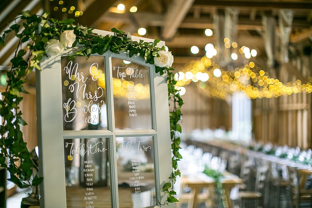 We wanted to keep everything elegant and timeless in regards to the decor with a focus on neutral white roses and oodles of green foliage, paired with some rustic elements to suit the barn’s interiors such as bare wooden tables and an upcycled glass paneled door as our table plan. Southend Barns looked after all the decor within their barn. We especially liked the amazing fairy lights that lit up the barn, along with their wild and green table decor which suited our style perfectly.
