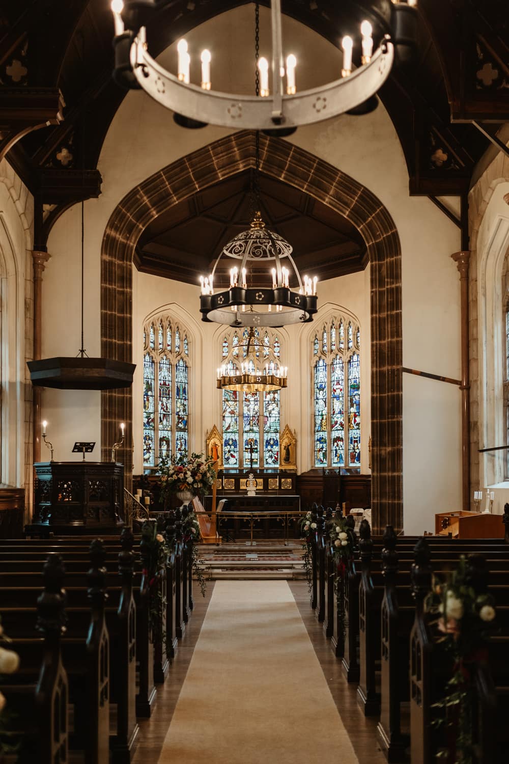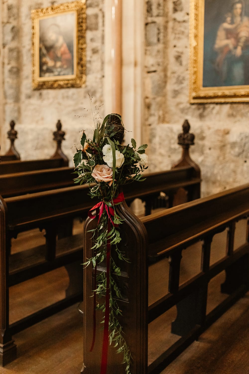 Since it was an October wedding, we went for a rustic, autumnal vibe. Our colour palette was sage, ivory, and burgundy. We chose the one and only Kim Dalglish, the absolute best to work with. She took our colour palette and theme and came up with the most stunning autumnal floral arrangements that were perfect for the venue. In addition to the bouquets and boutonnieres, there were pew decorations, a gorgeous pillar bouquet for the altar, greenery and candles lining the banquet tables, and a gorgeous arch and garland over the fireplace in Tenant’s Hall for the reception.