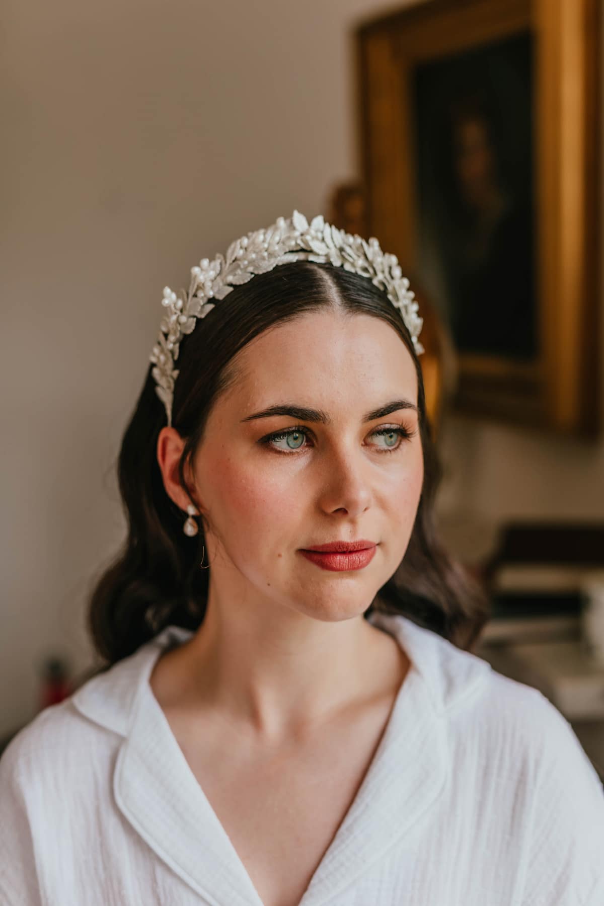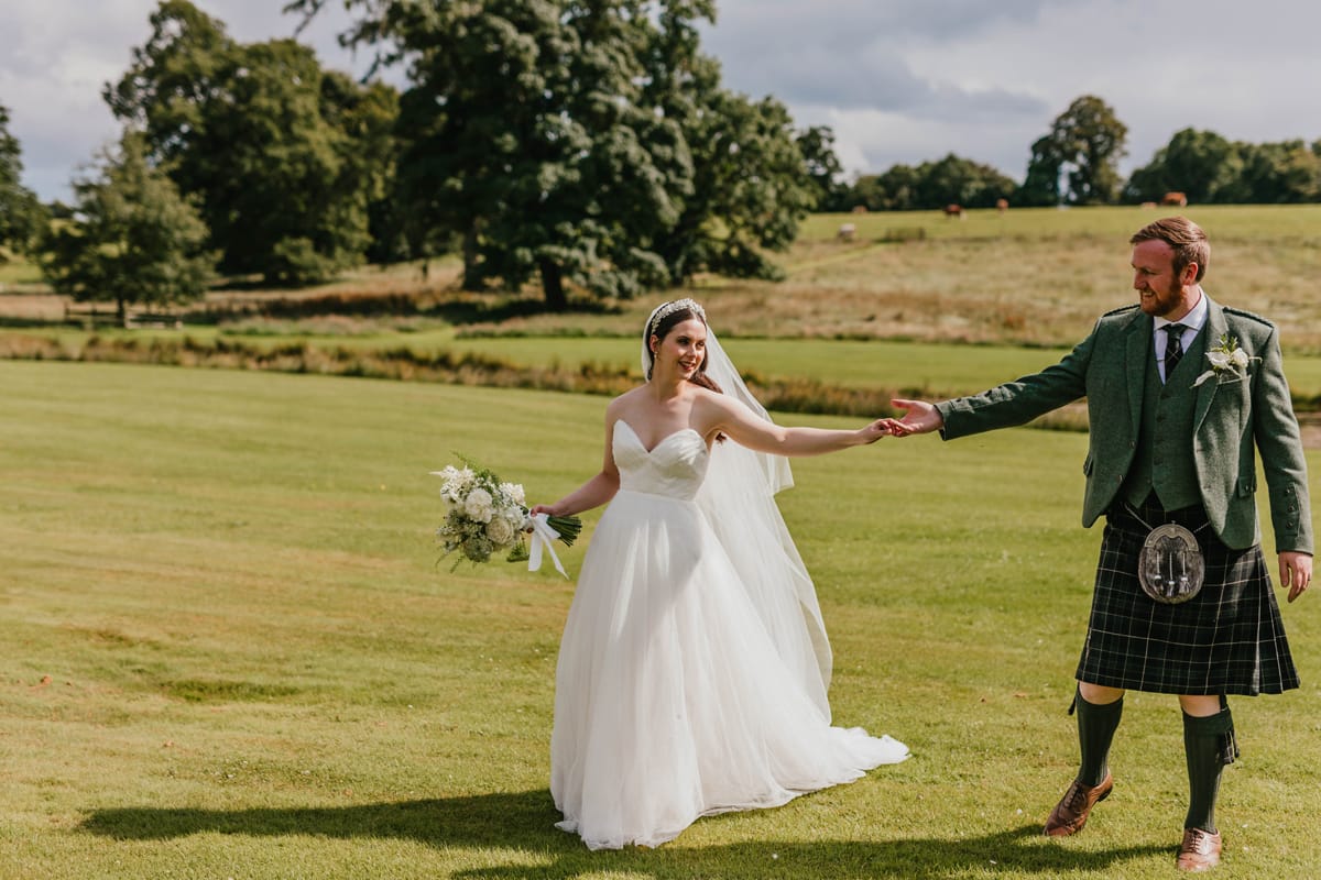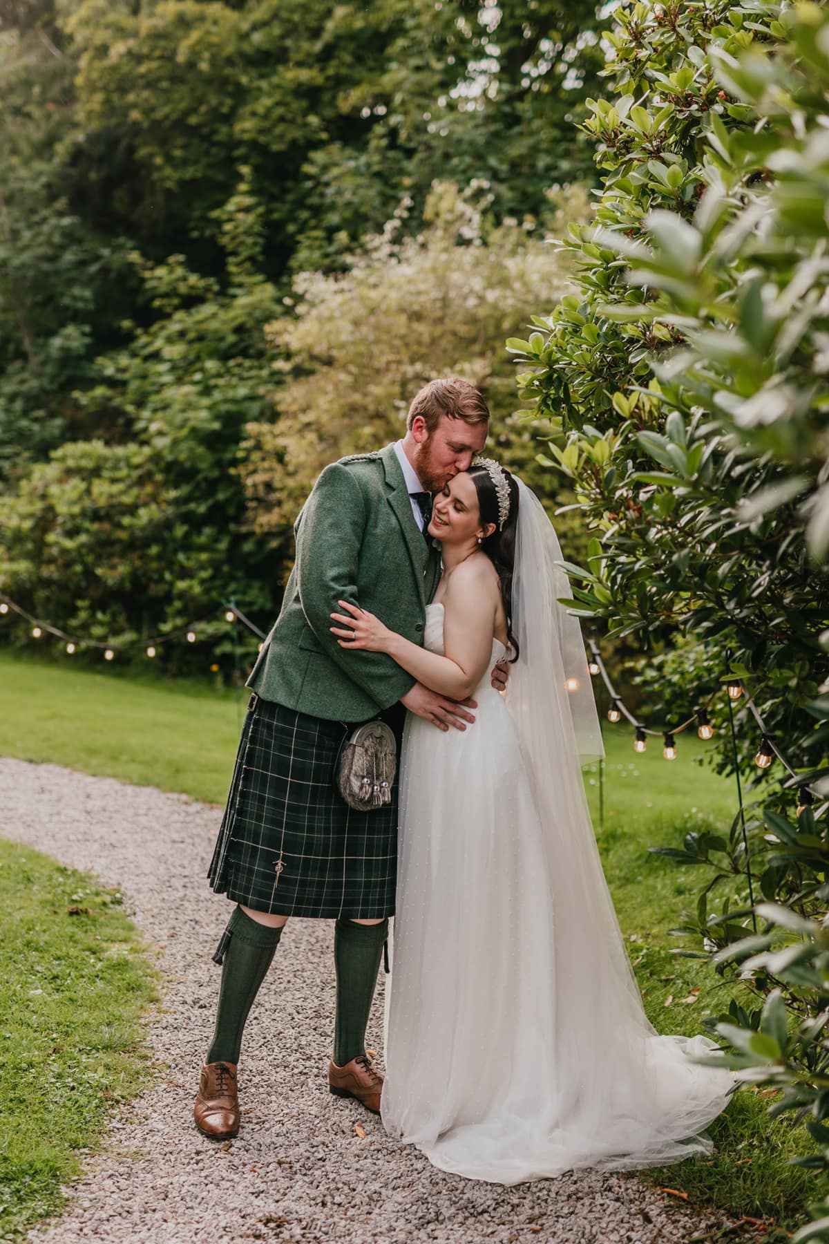 I wore a dress made by Sassi Holford with a wreath crown designed by Scarlett and Wolfe. David wore a Hunting Pride tartan kilt with a dark green tweed jacket from McCalls.