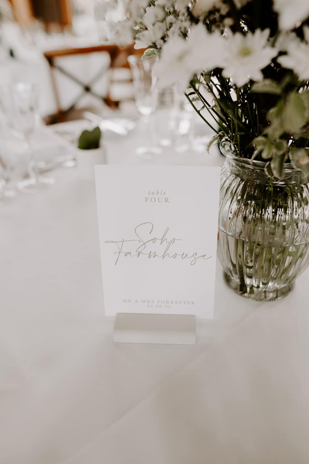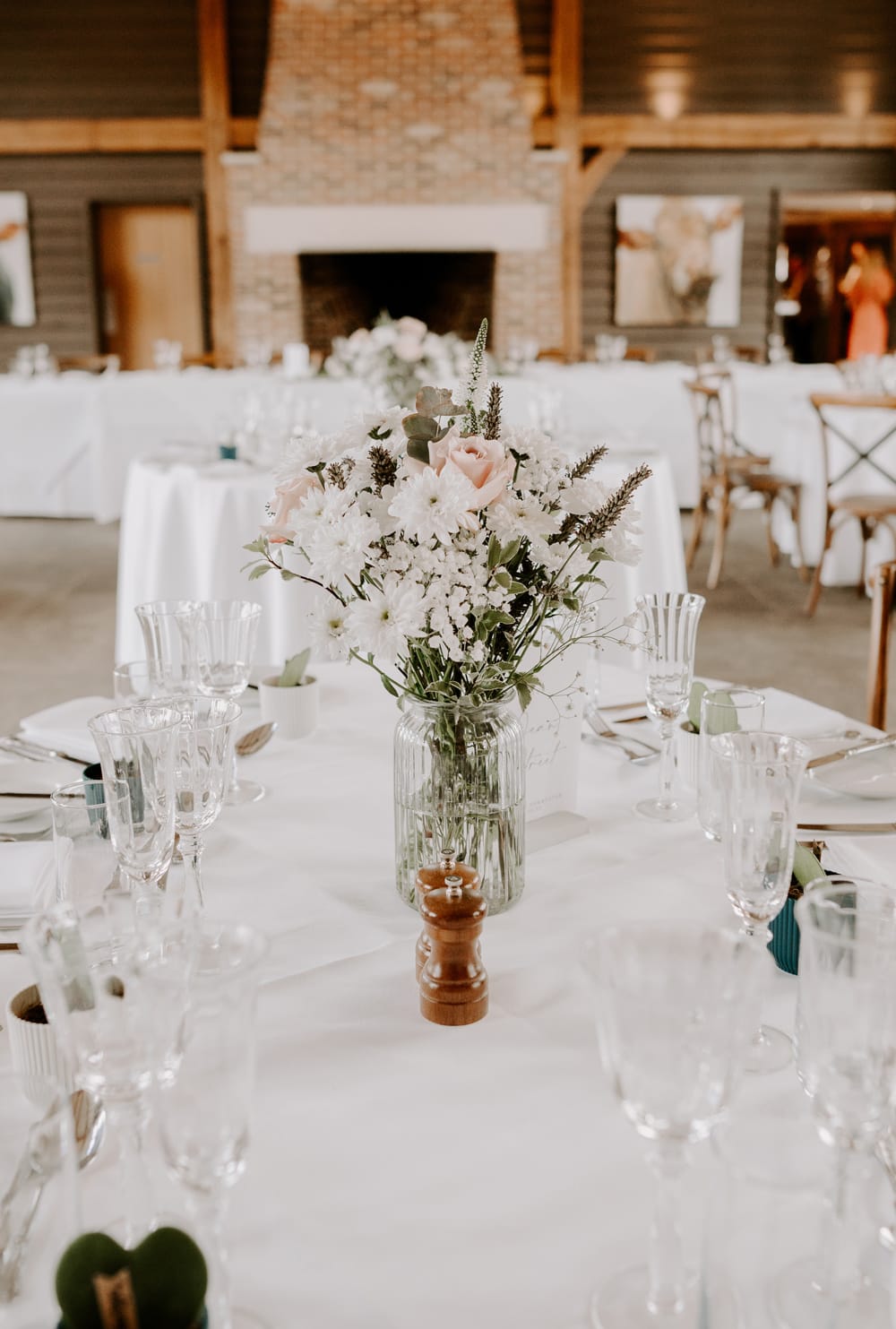 Retreat East is such a beautiful venue that I didn’t want much else in the way of decor. The wedding was simple and stylish with white and neutral florals and table decor.