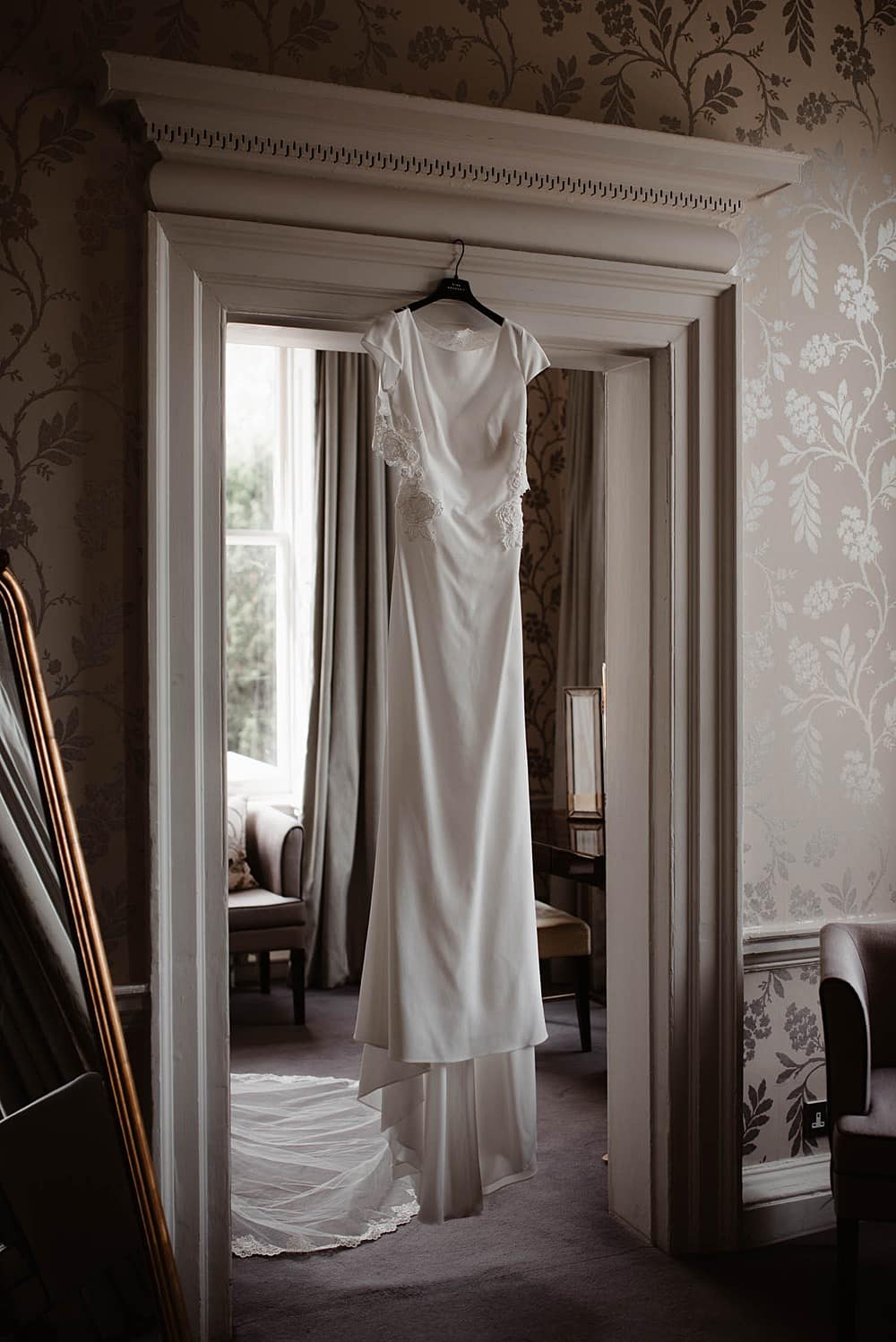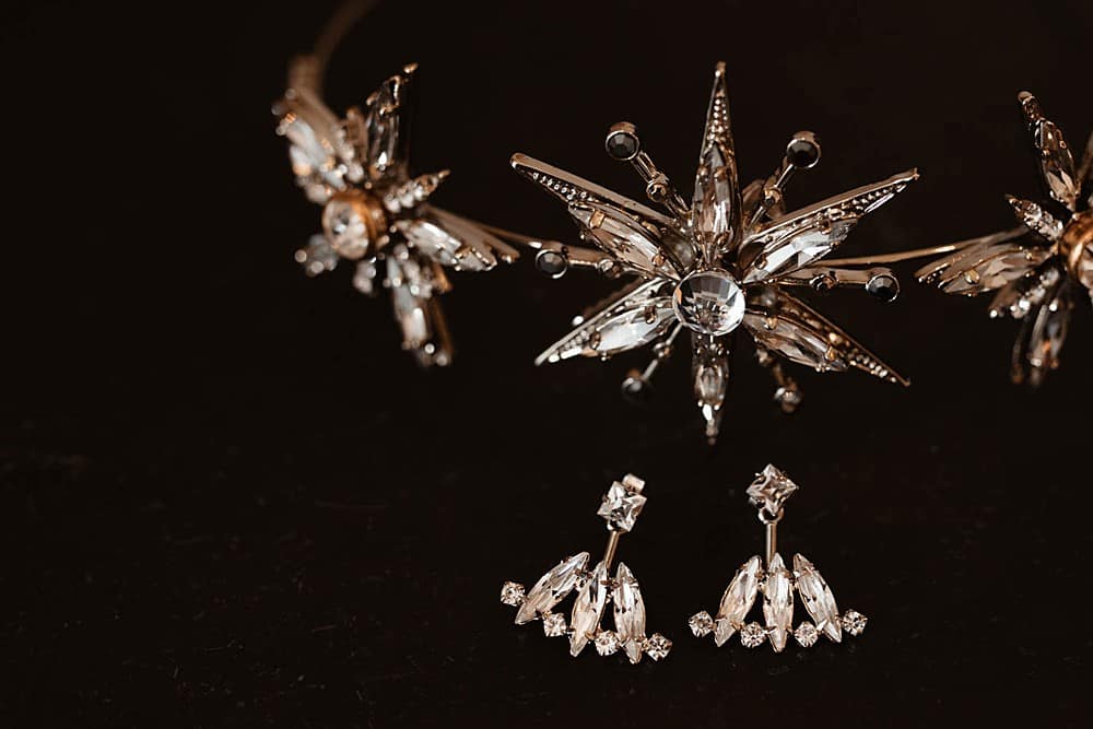 I wore the Devin dress by Rime Arodaky, purchased from The Mews Bridal. I knew I wanted a relatively simple and elegant dress with a column silhouette, but I was looking for something a bit special and different too. As soon as I tried on the Devin dress I knew it was the one before I even looked in the mirror. It fit like a glove and made me feel great! I loved that it looked chic from the front but had a statement low back adding a bit of drama. The appliqué flowers also fit perfectly with our overall theme! I had a stunning Swarovski crystal star headband and earrings custom made by Tilly Thomas Lux and I had a lace trim cathedral length veil specially made for me by the wonderful Joanna from Woburn Bridal. I wore the headpiece at the back of my head during the ceremony, under my veil, then moved it round to be a headband for the wedding breakfast onwards when I removed the veil.