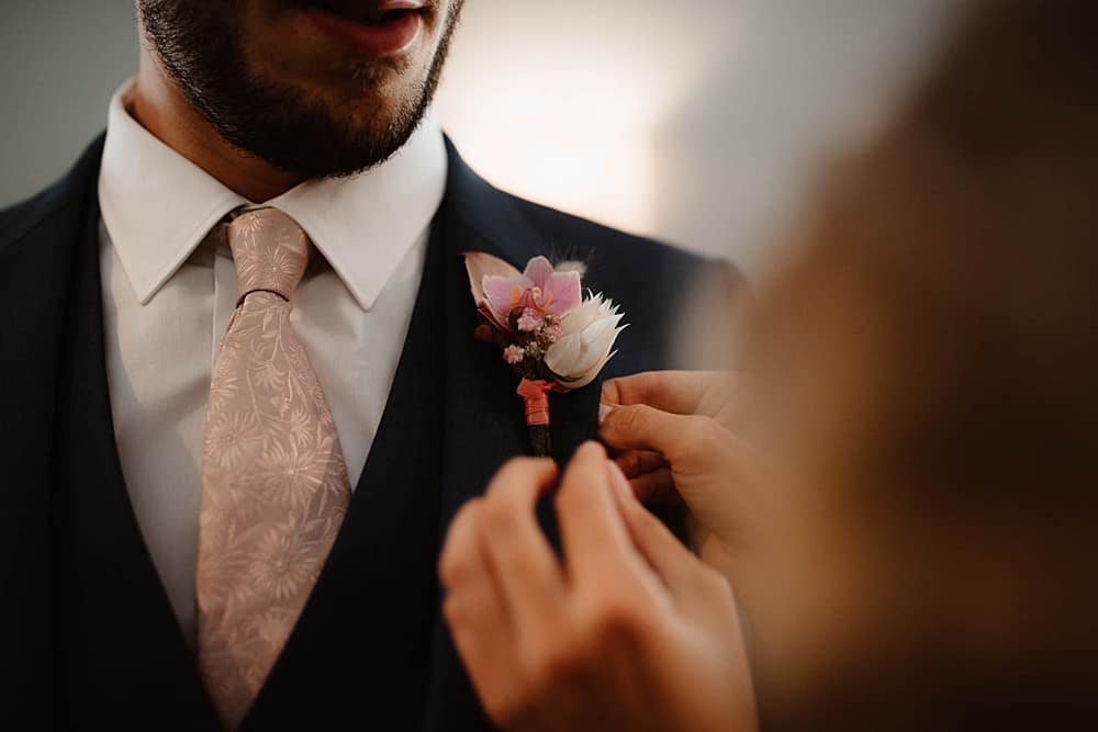 Tom wore an electric blue tailored suit from Paul Smith, worn with white shirt, pink floral tie and multi-coloured striped socks – chosen and fitted by the team at Paul Smith Floral Street in London. He paired with Classic dark brown brogues by Russell & Bromley. Mr Hoare had groomsmen and groomswomen – the men wore navy suits of their own choosing, complimented with floral pink ties and an array of colourful socks. The women wore navy blue jumpsuits from Whistles.