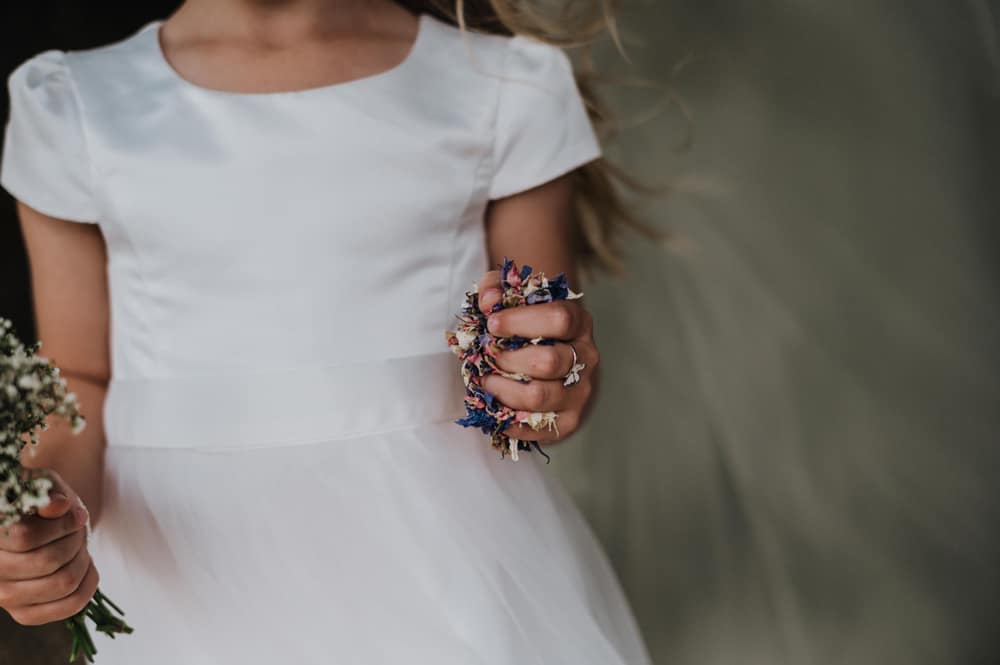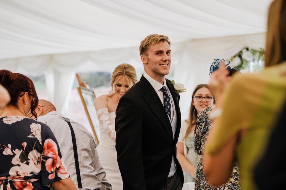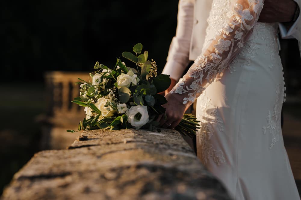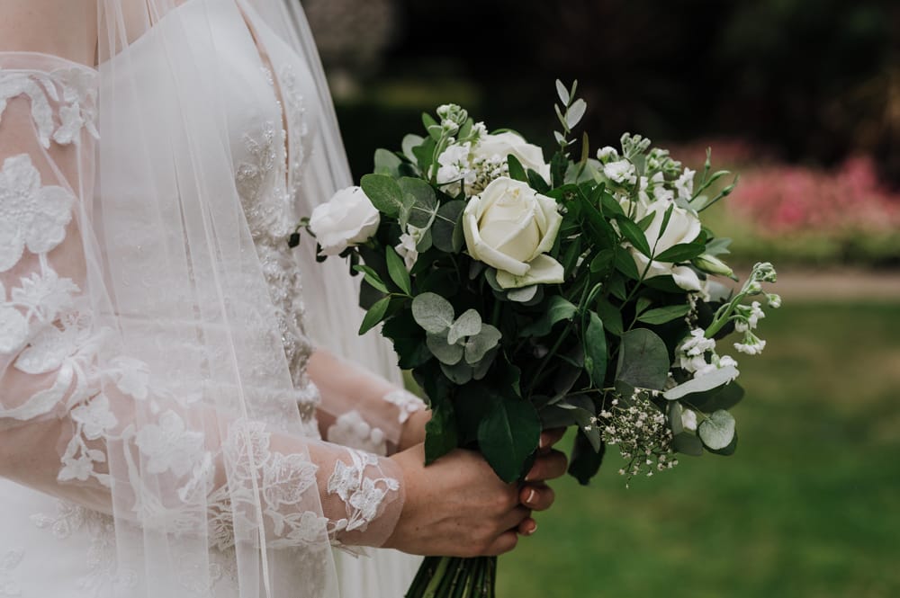 The Walled Garden venue was already so pretty so we kept the flowers simple yet beautiful with white gypsophila, roses and hydrangeas on the tables and a garland around the marquee entrance. These were mirrored in the bridal bouquet and buttonholes.