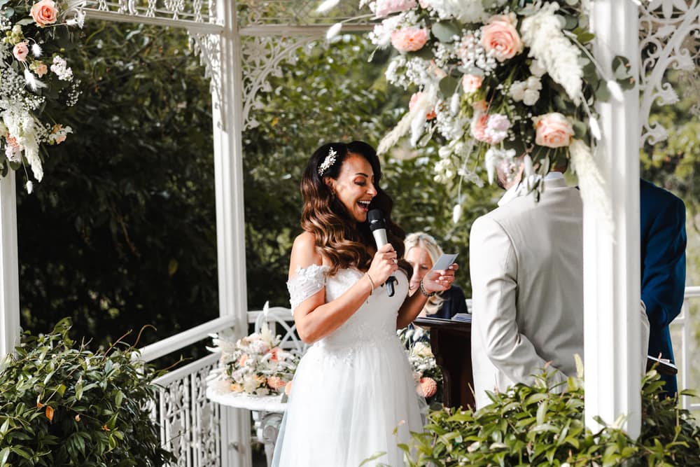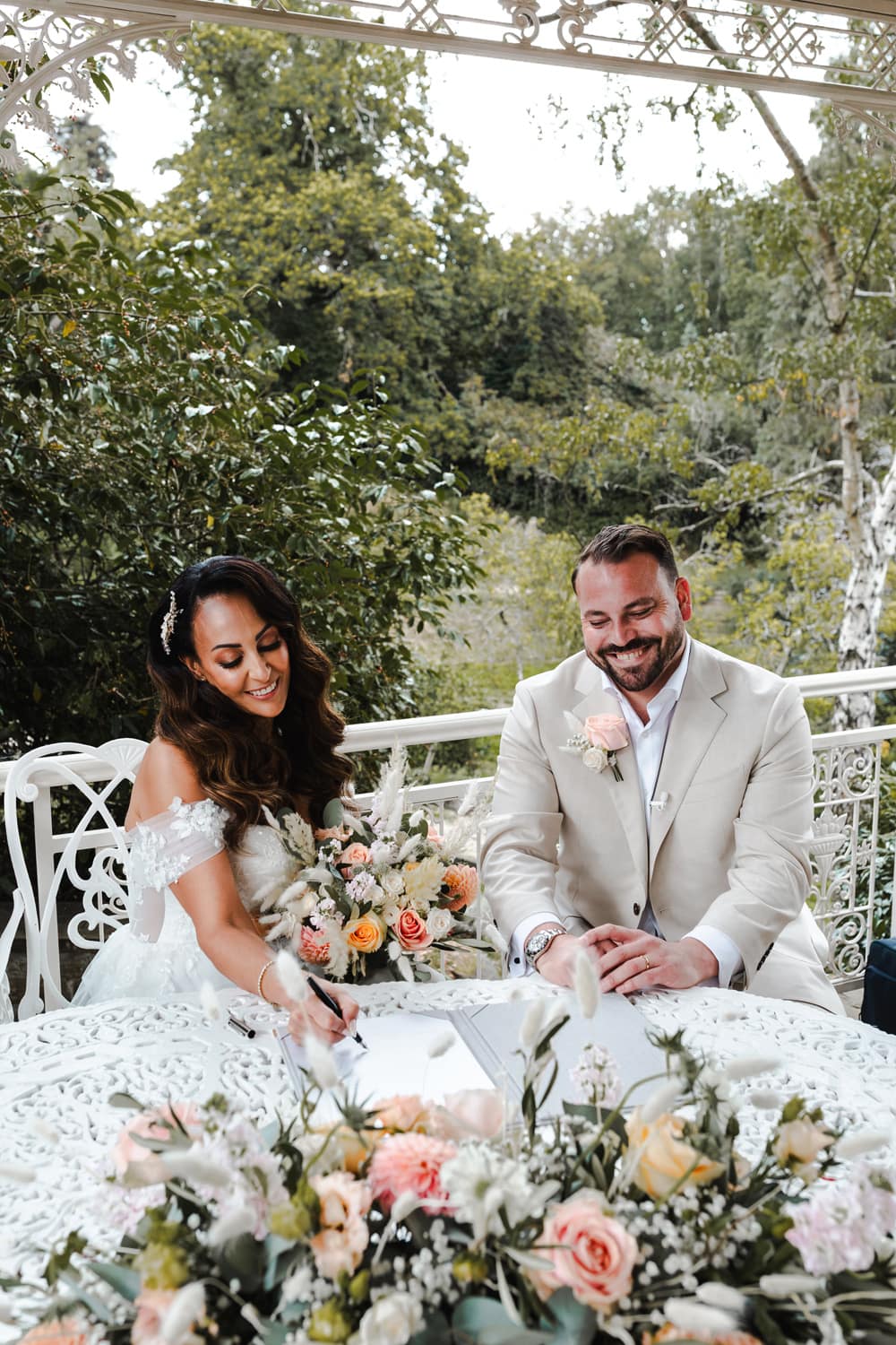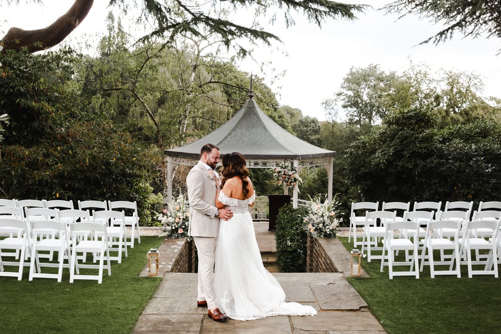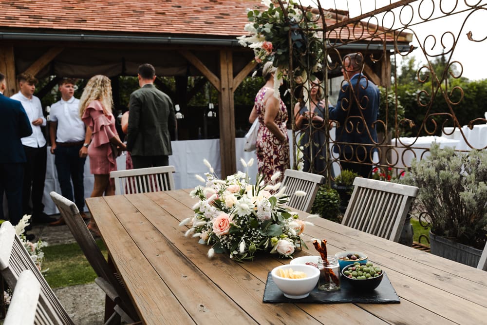Initially, we planned a registry office wedding followed by an intimate BBQ on the lily pond terrace for close family. But in the end, we had a two-day celebration with an intimate dinner and a small evening ceremony on the Pavilion. We chose as many guests to join us for dinner as could comfortably fit around one table. Saturday was then dedicated to celebrating! We wanted to host our friends and family outdoors with daytime and evening entertainment and a relaxed BBQ meal, followed by a drinks reception with canapés. The theme was summery, and the colour palette was peach, rose gold, ivory accents, and sage and olive greenery. We wanted a relaxed, welcoming, and romantic effect. We defied tradition wherever possible.