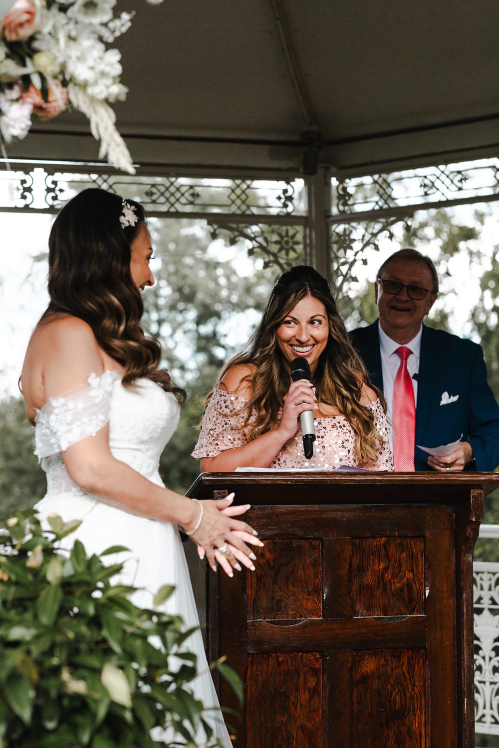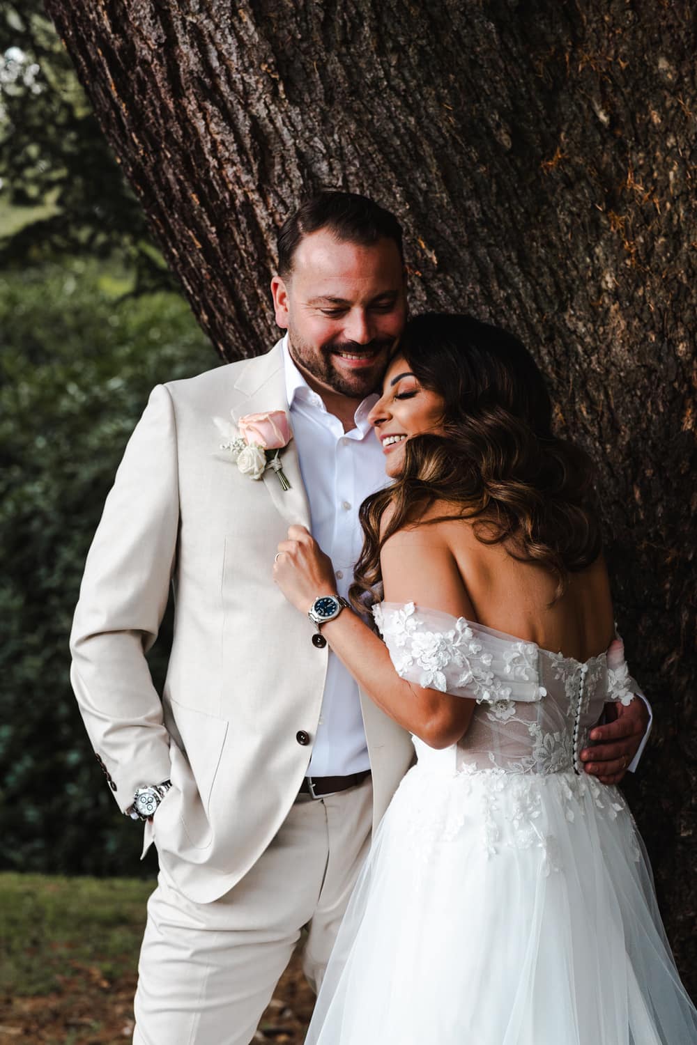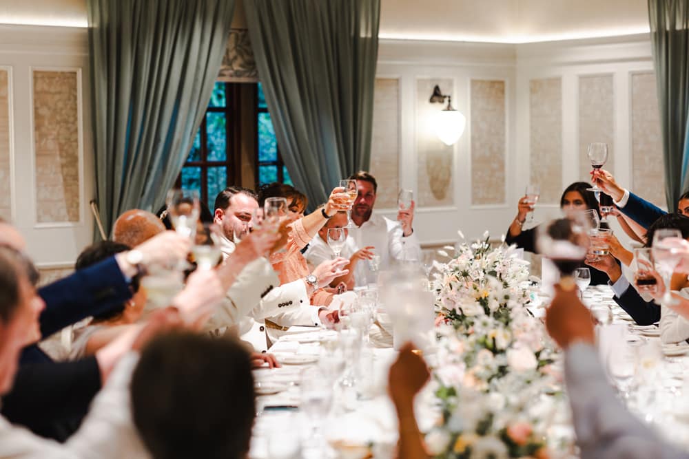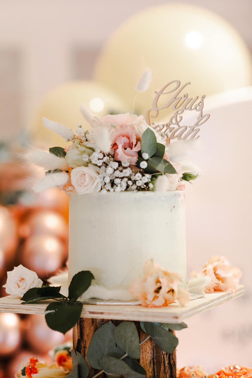 Initially, we planned a registry office wedding followed by an intimate BBQ on the lily pond terrace for close family. But in the end, we had a two-day celebration with an intimate dinner and a small evening ceremony on the Pavilion. We chose as many guests to join us for dinner as could comfortably fit around one table. Saturday was then dedicated to celebrating! We wanted to host our friends and family outdoors with daytime and evening entertainment and a relaxed BBQ meal, followed by a drinks reception with canapés. The theme was summery, and the colour palette was peach, rose gold, ivory accents, and sage and olive greenery. We wanted a relaxed, welcoming, and romantic effect. We defied tradition wherever possible.