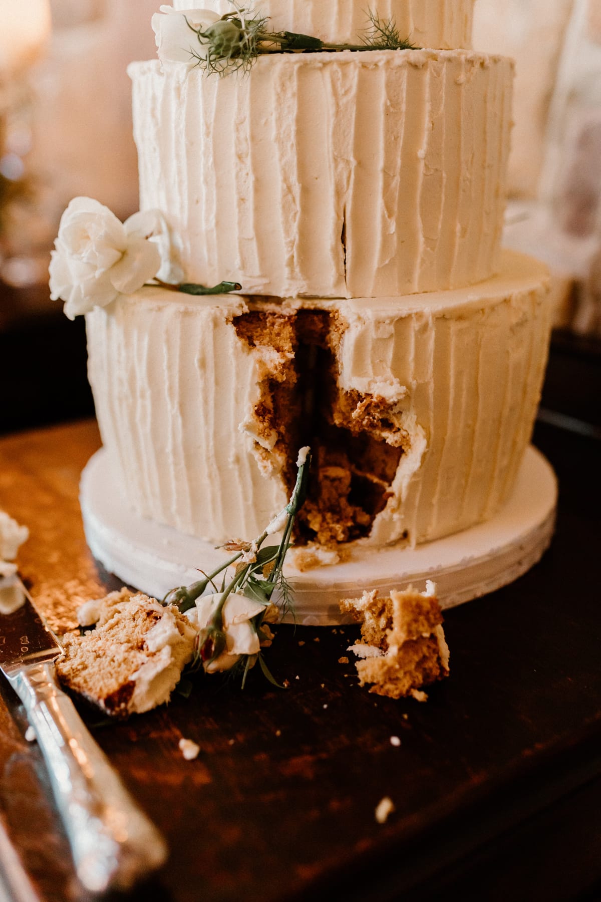 The Mother of the Bride made our cake. A three-tier cake made up of a Biscoff cake, a Victoria sponge cake, and a lemon cake, with flowers from Sutton Lodge. Our guests devoured it within record time!