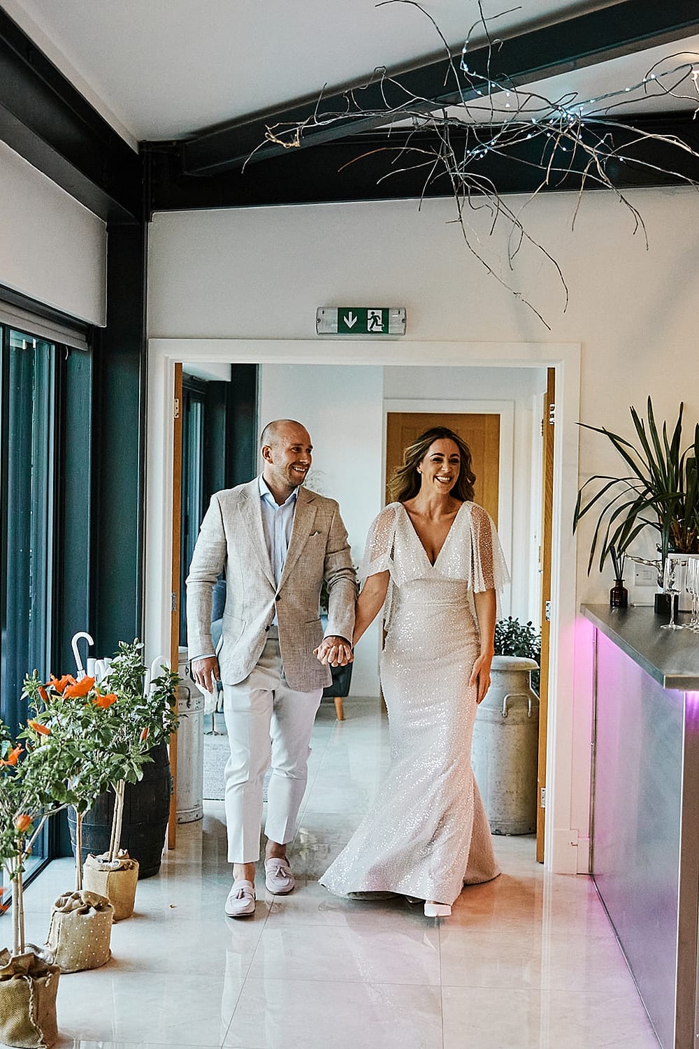 The afternoon then continued as guests made their way down to the most exquisite sail-top marquee built by Peacock & Bow, overlooking the lake where guests were filled with course after course of delicious food and wine, followed by non-stop laughter and endless smiles as the speeches ensued just as the sun was setting across the lake, making for the most beautiful golden hour glow, all captured by the Australian Photographer and Videographer team Dear Vincent. The party then continued back in the courtyard and main barn to where chairs and tables had all been removed leaving only poiser tables to accommodate the ultimate dance floor to rival any A-list club. The music, the laughter, the styling and the atmosphere that encapsulated every guest was second to none.