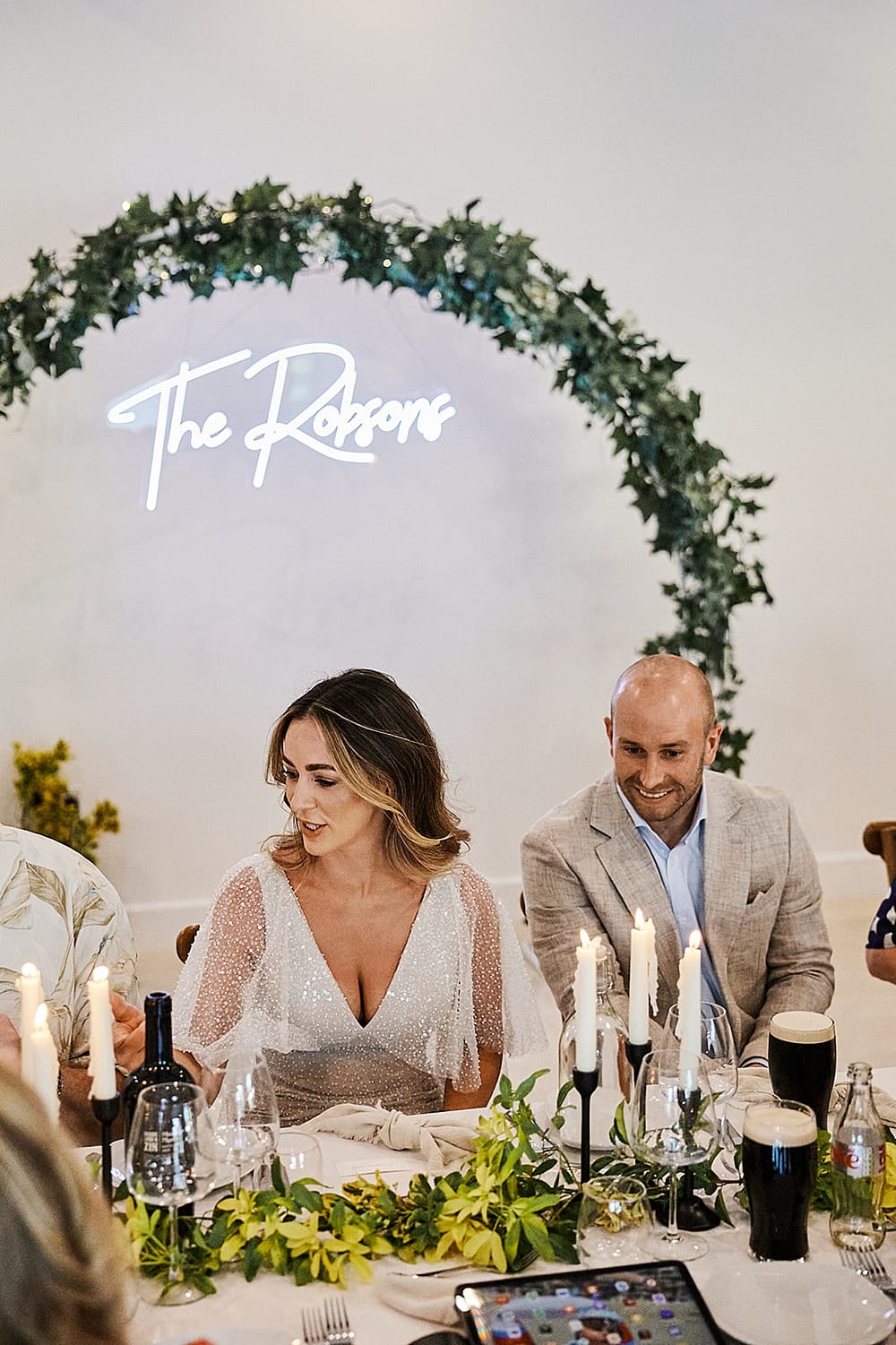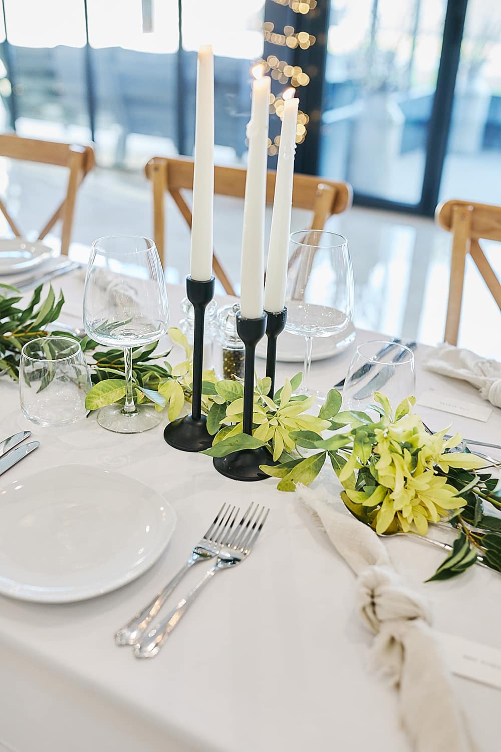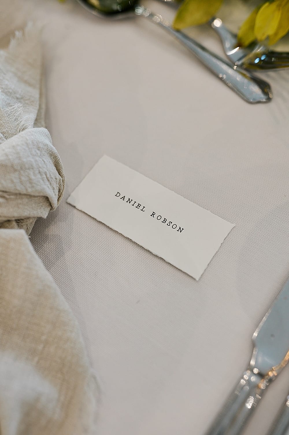 The beauty ofĀ Hanbeck FarmĀ – the gardens, the courtyard, the modern twist on rustic rural charm – goes hand-in-hand with the traditional stonework that’s showcased throughout both barns, all set against minimalistic design that is simply breath-taking. The barn was initially styled on the Friday evening for their epic rehearsal dinner for 36 of their nearest and dearest guests, most of whom were staying on site in the accommodation barns that branch off from the courtyard, or down by the lake in shepherdsā huts. Guests were welcomed in for dinner to the fun filled tunes of a pianist who filled the room with perfect tones as they found their seats around the longest banquet table that spanned across the room showcasing a 42-foot foliage runner, tapered candles scattered in between, linen napkins and personalised place settings.
