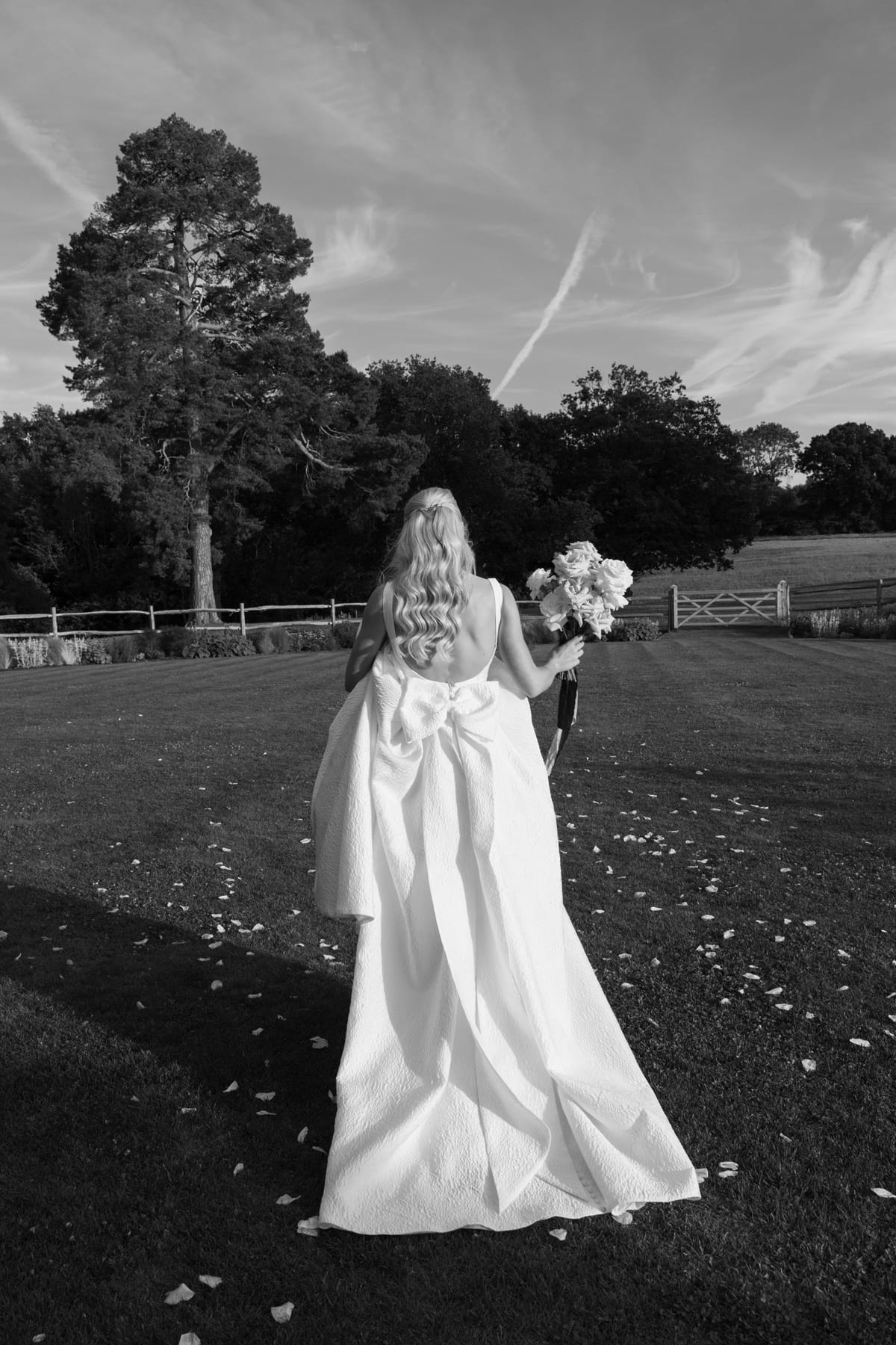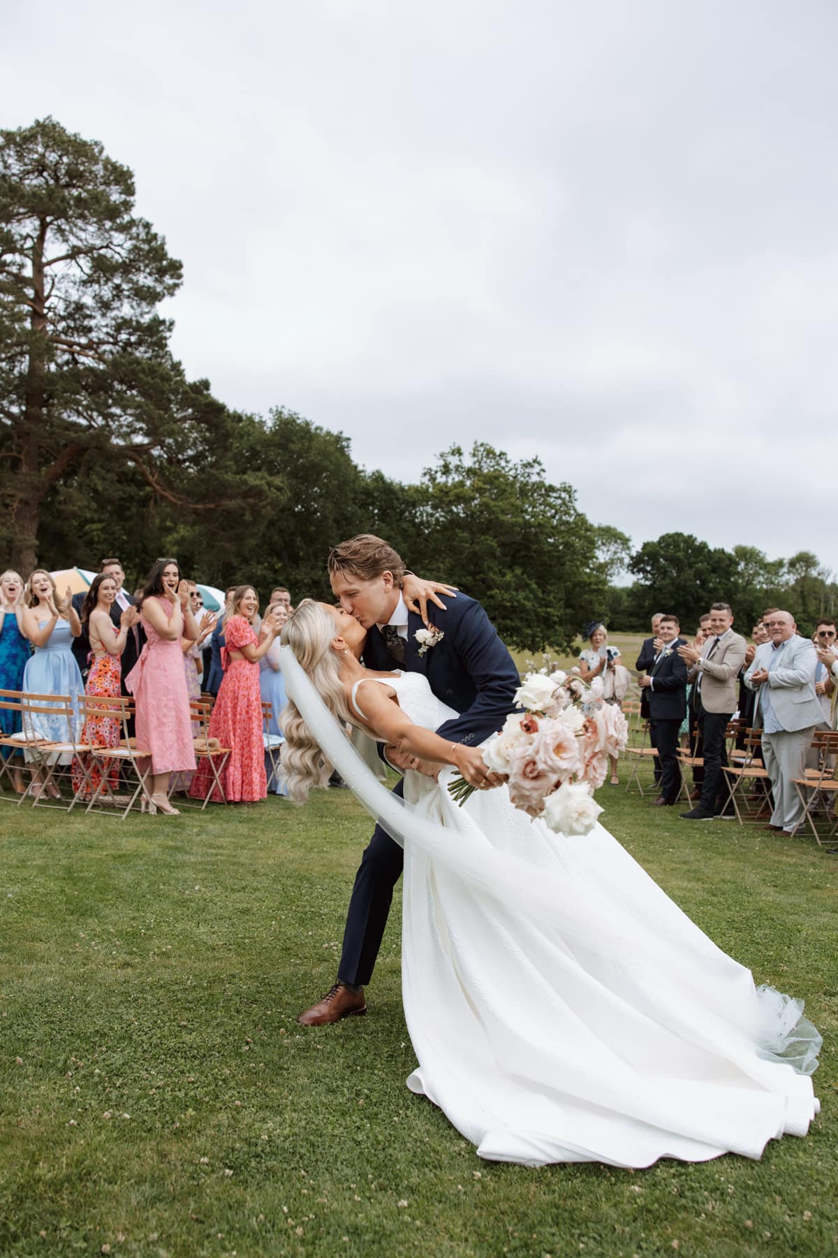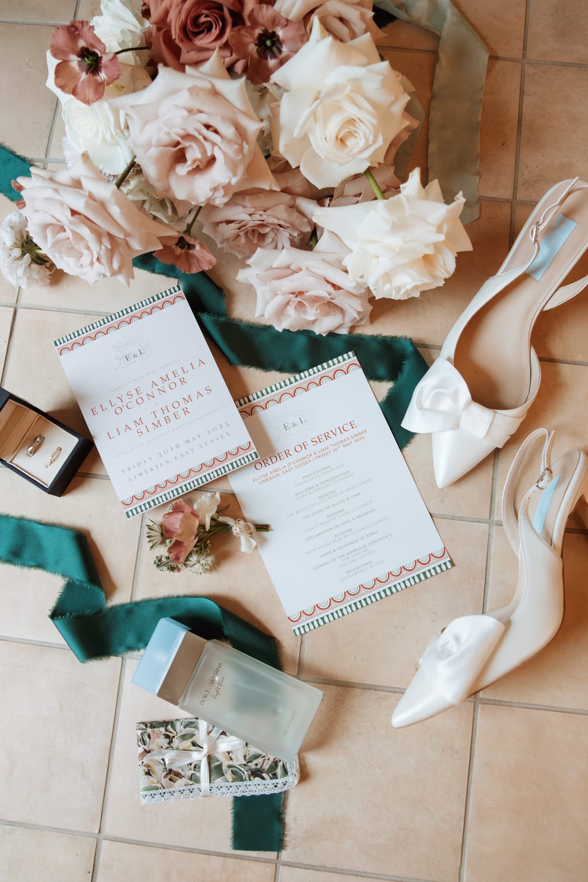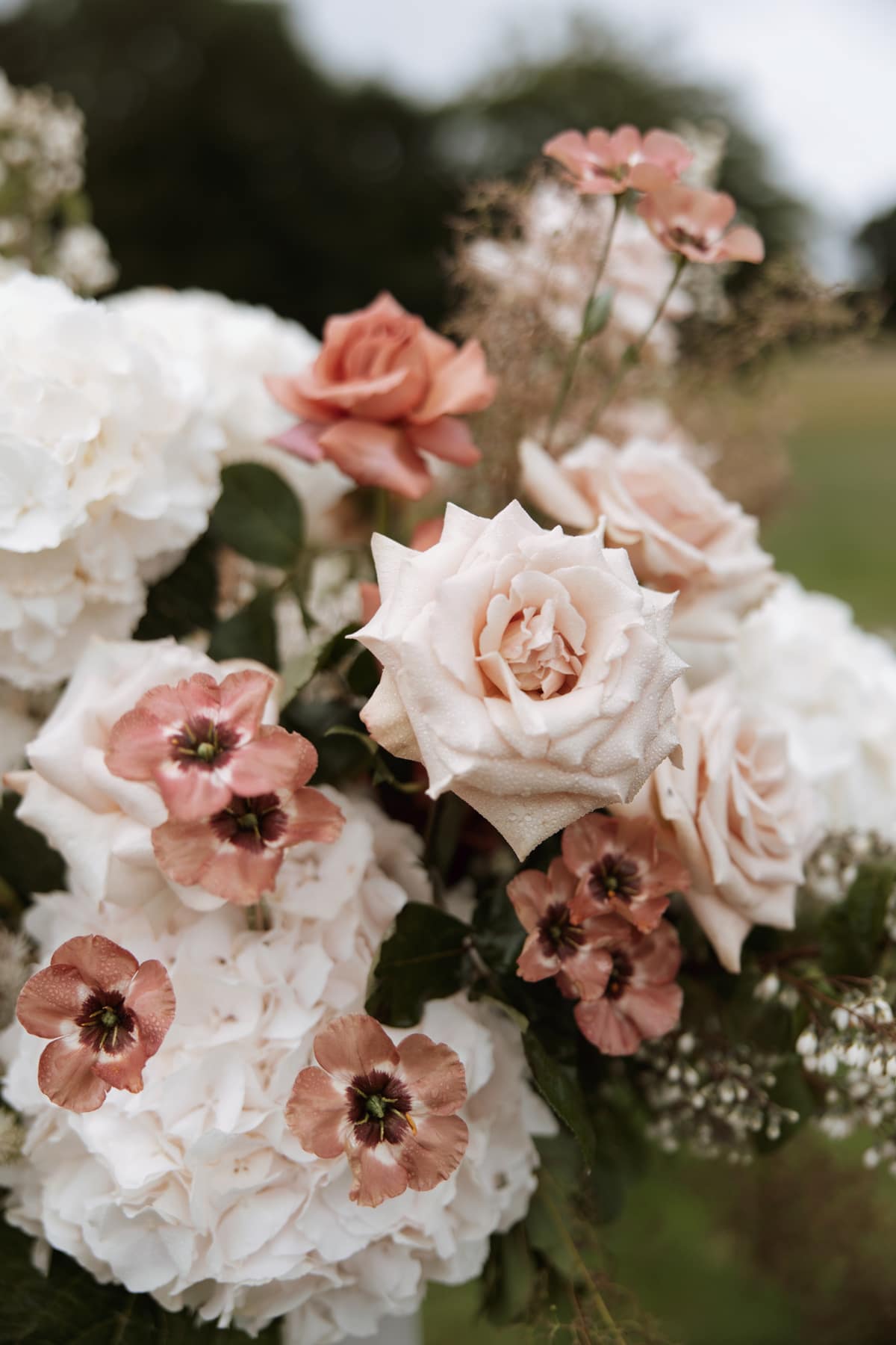 The florals by The Bloominati Florist were a defining part of the day’s design, with a palette of soft blush, ivory, and muted rose tones that felt both romantic and fashion-forward. Layered garden roses added texture and abundance, while statement urns overflowing with blooms framed the ceremony in the most striking way. Later, draped fabric paired with sculptural arrangements gave the portraits and outdoor spaces that editorial edge. From the ceremony through to the tablescapes, the flowers tied everything together with warmth, intimacy, and understated luxury.