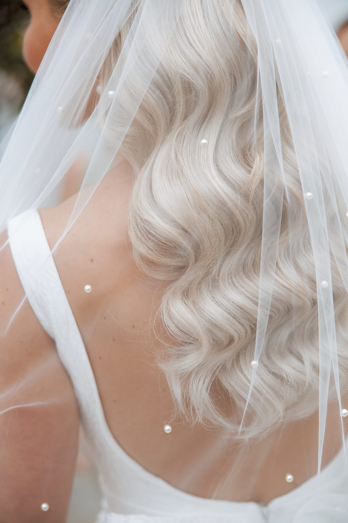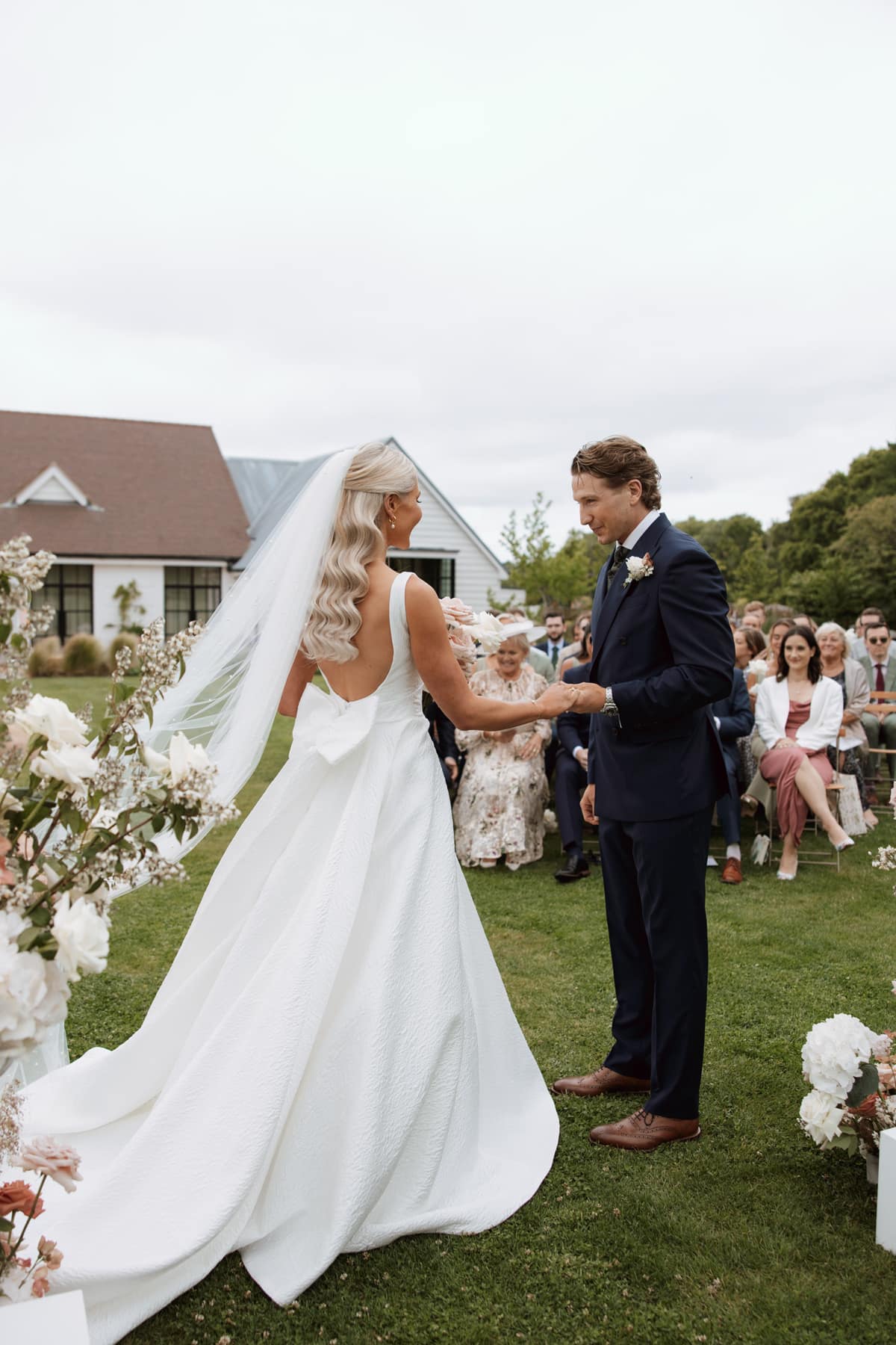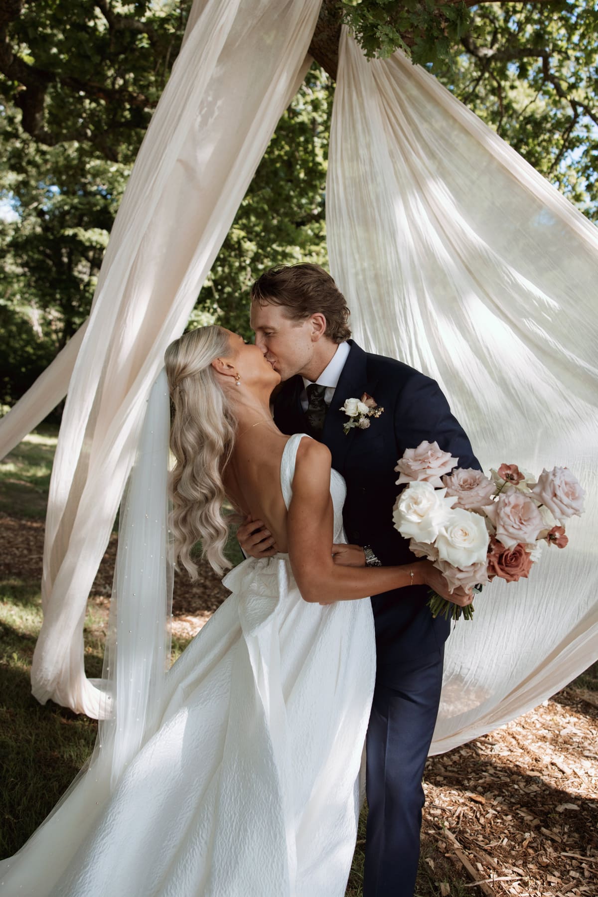 Ellyse wore the most stunning Freda Bennett gown—featuring a structured bodice, voluminous skirt, and a timeless feel that suited her perfectly. She paired it with sleek hair, a delicate veil, and a bouquet of blush, ivory, and dusty pink roses for a look that was classic with a modern twist. The groom’s navy suit balanced it beautifully—understated, sharp, and perfectly tailored.