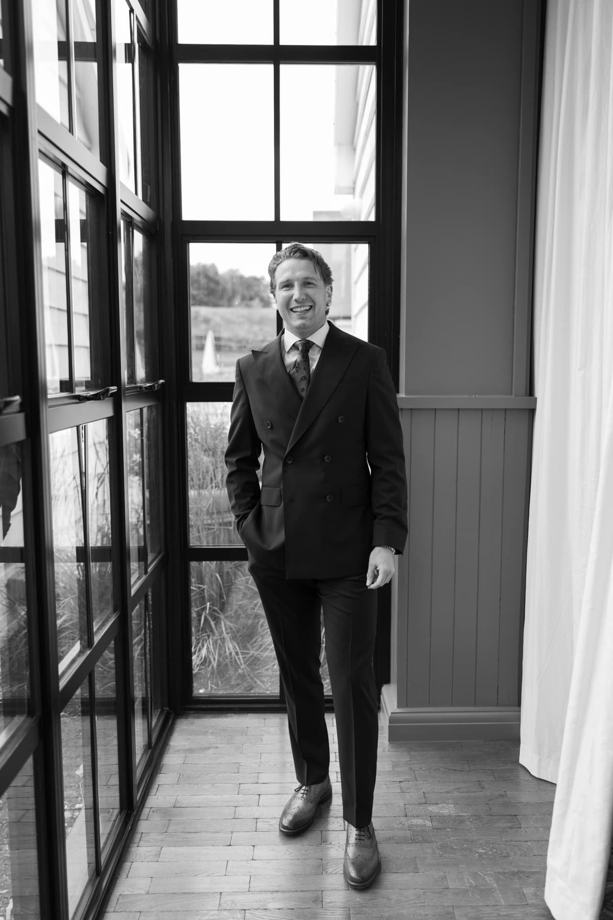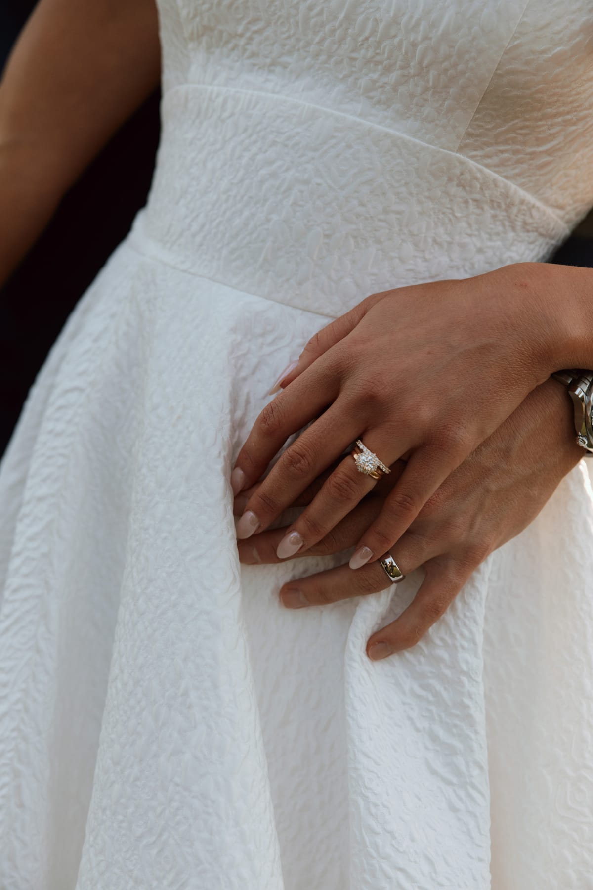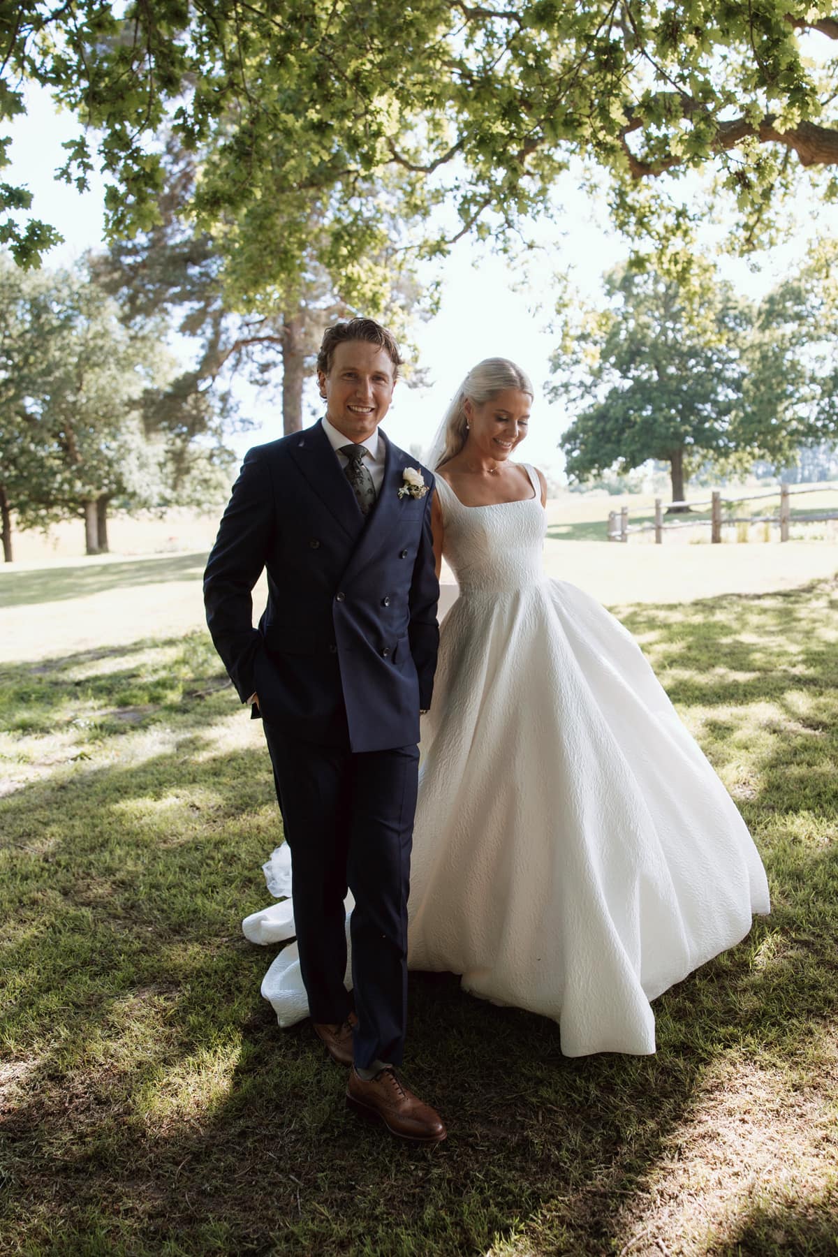 Ellyse wore the most stunning Freda Bennett gown—featuring a structured bodice, voluminous skirt, and a timeless feel that suited her perfectly. She paired it with sleek hair, a delicate veil, and a bouquet of blush, ivory, and dusty pink roses for a look that was classic with a modern twist. The groom’s navy suit balanced it beautifully—understated, sharp, and perfectly tailored.