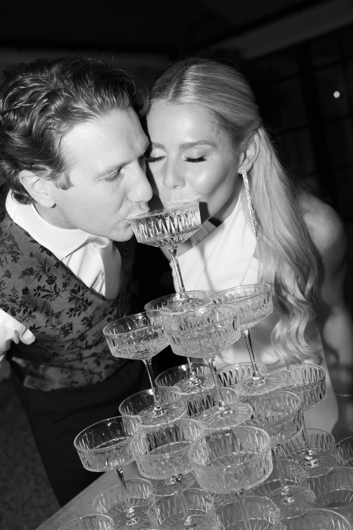 After dinner, a live saxophone lifted the party into full swing, and the couple kicked off the dancing with a champagne tower—an effortlessly glamorous moment that set the tone for the night ahead.