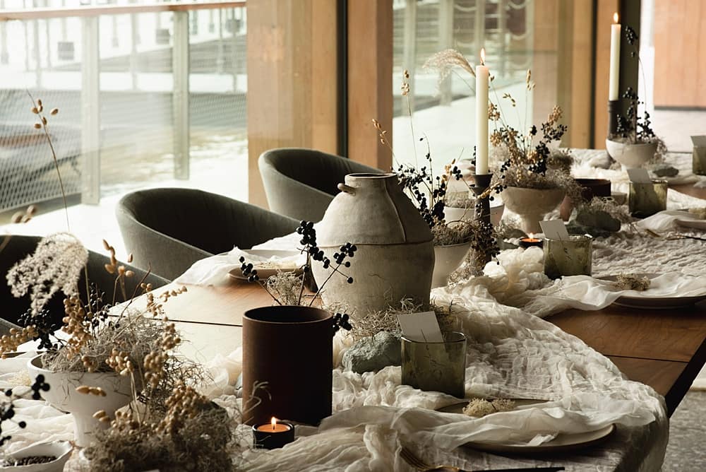 The shoot features muted and earthy tones that reflect the colours and surroundings of the river. It also includes natural and raw materials, contrasting textures and wild florals that are inspired by river marshes and the elements used for the structure and interiors of the carefully designed Woods Quay.