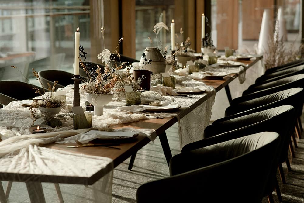 Seeing as the venue offers an idyllic space for a long dining table, we wanted the main focus to be on a beautifully styled tablescape. Set against deep green, verdigris and granite grey of the embankment, the terrazzo floors reflect the river’s shingle banks, embedded with years of lost treasures. And it’s from these surroundings that our dramatic tablescape took inspiration. An earthy colour palette, full of texture, hand-made ceramic pieces and delicately placed stone. Loosely placed drapes reflected the ever-moving water of the River Thames, with it’s over-lapping edges reminiscent of soft waves hitting the pebbled shoreline. Either side of the table sat large floral installations that reflect the wild, overgrown marshes and river banks that surround the Thames.