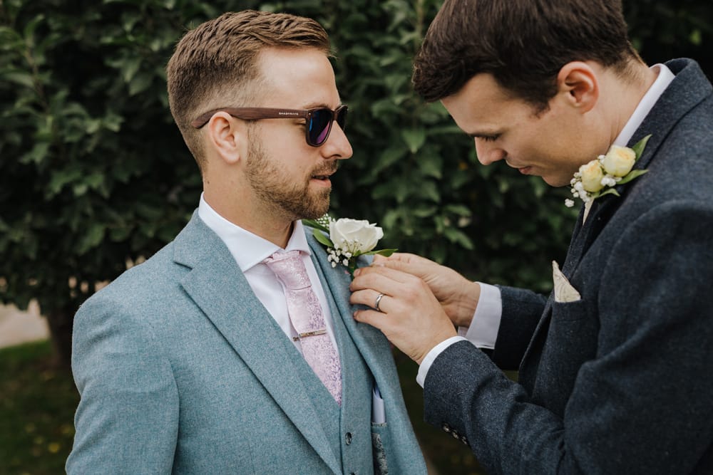 Reece wore a tailor-made custom suit from Moss Bros, a sky-blue herringbone three piece. He chose this as it perfectly complemented the bridesmaid dresses which had already been chosen from David’s Bridal, and it was the same style as the groomsmen’s suits but a different colour which was a nice way for him to stand out.