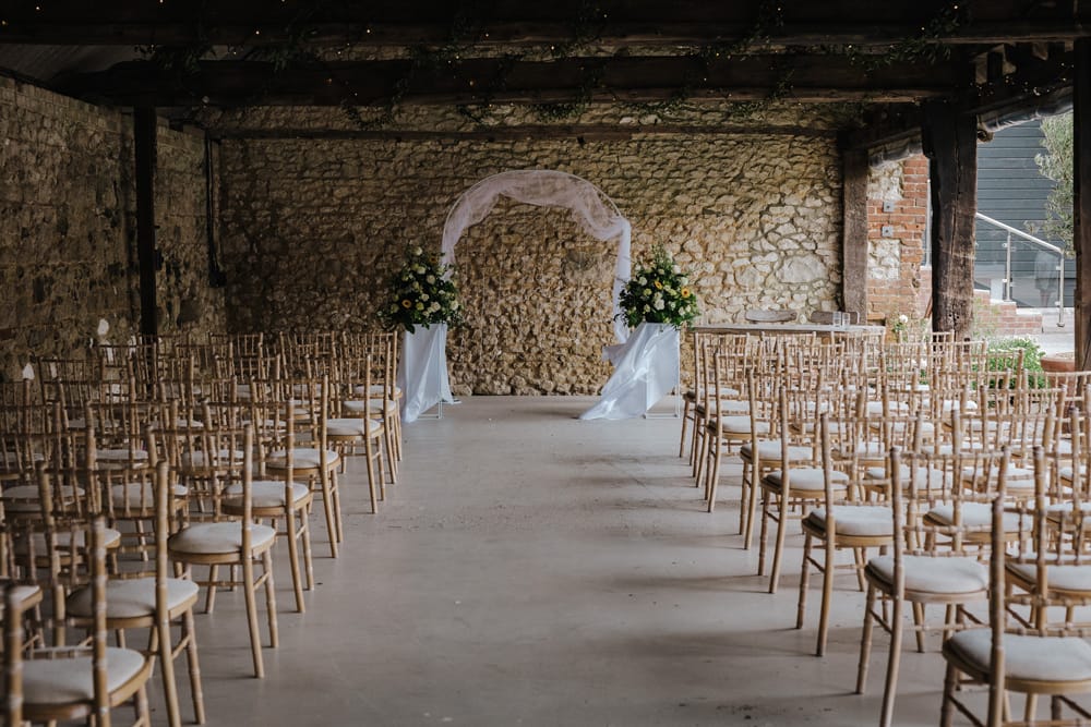 Neither of us are particularly creative or gifted when it comes to design so we just wanted to go for something light, bright, and modern. The great thing about East Afton was that we didn’t need to do much in the way of decorating for it to still look amazing! There were a couple of aspects we knew we wanted. Early in our relationship Reece bought me a bouquet of yellow roses which I loved, and this became a bit of a regular theme so we knew we had to have yellow roses in the decor and flowers! The other aim was to include our love of gin in the day. We spent two years in between our engagement and wedding collecting empty bottles of our favourite gin to use as centerpiece decorations – a lot of our family and friends were receiving bottles of gin as birthday and Christmas presents with the express instructions to drink them before September 3rd 2022! And of course we did a lot of the heavy lifting ourselves…