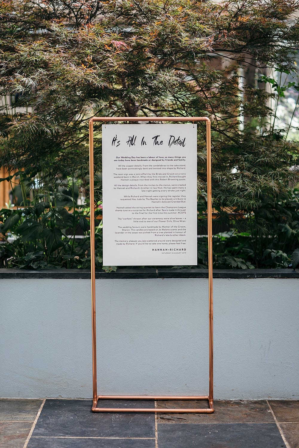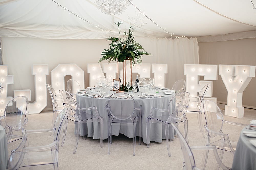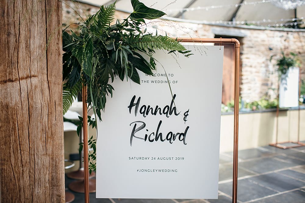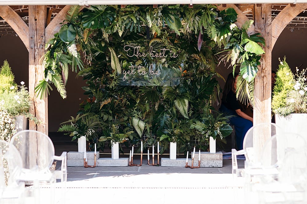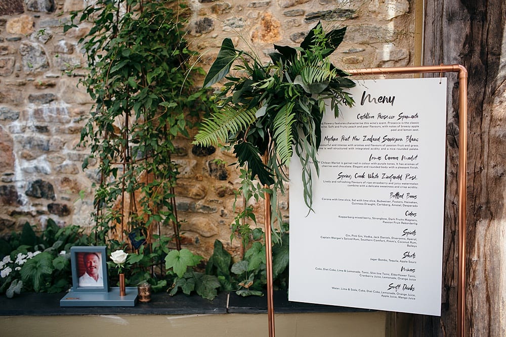 Classic, laid back elegance was the look we were going for and details were key for me – every “guest touch point” was considered (can you tell I’m a marketeer?). Pinterest can become addictive when planning an event – you pin largescale installations without ever really considering the logistics of implementing something like that within a rural wedding venue in Devon. Thankfully, Richard is a builder by trade and honestly brought my Pinterest board to life! Everything I showed him he set about recreating, from the copper stands and centrepieces, to the personalised remembrance plaques to the amazing neon sign that formed part of our fabulous foliage backdrop. He even made our cake stand and fabulous copper candelabras that now sit pride of place on our dining table at home. Everything felt so bespoke and it all came together exactly as we’d hoped.