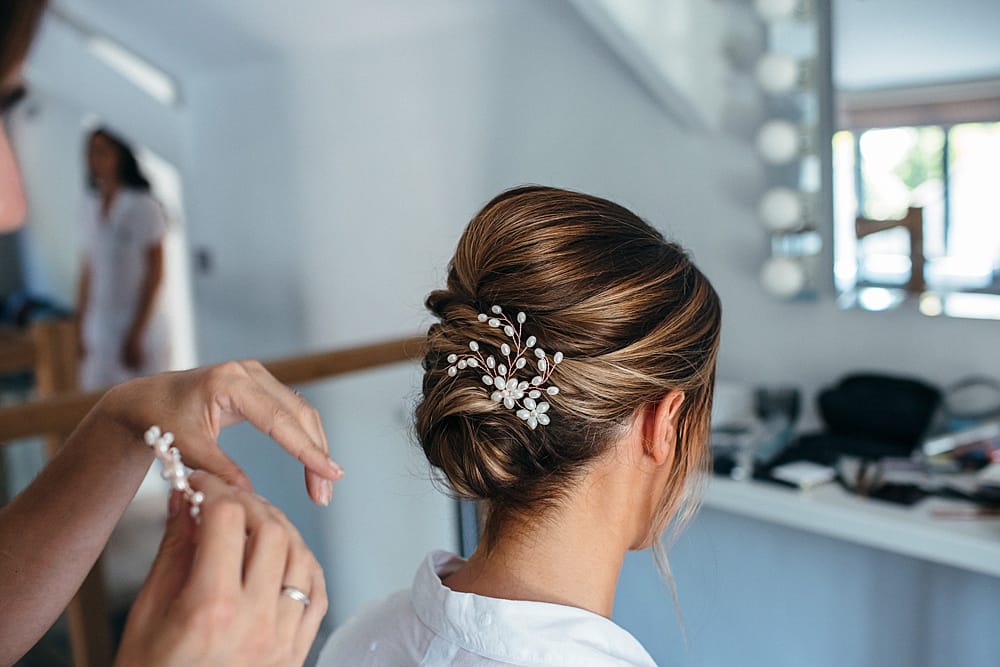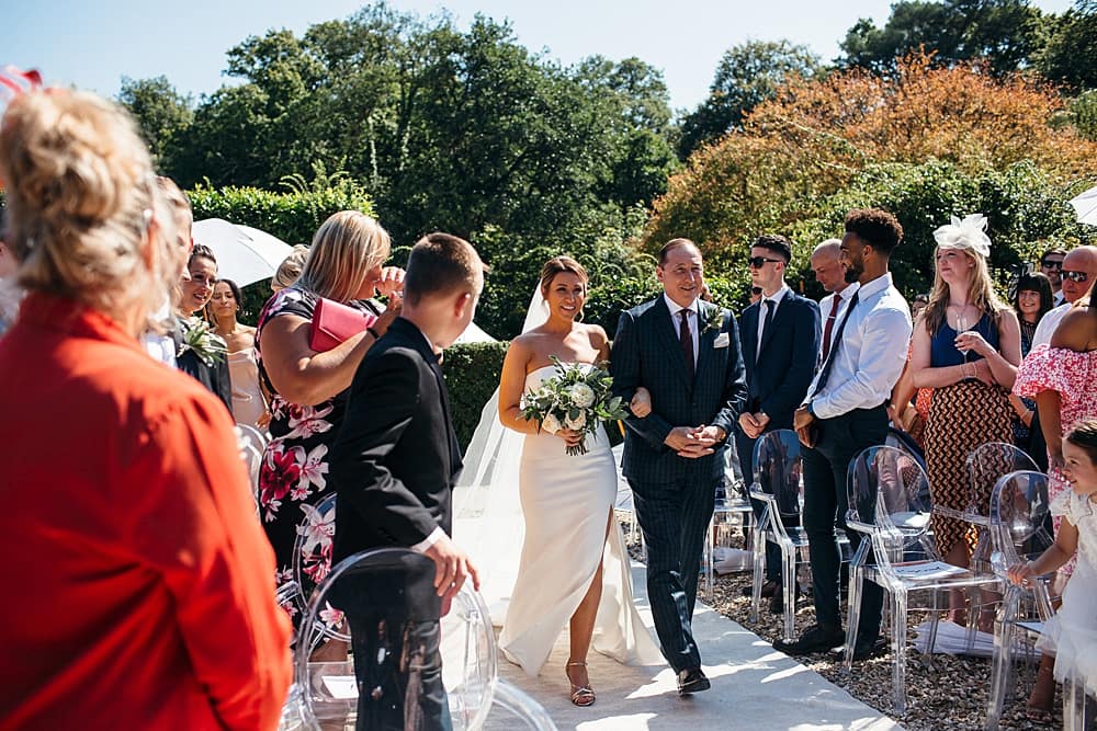 As my something “new” my Mum and Dad bought me a beautiful pair of diamond Dinny Hall earrings, my something borrowed was my Mum’s diamond tennis bracelet and my something blue came in the form of my bouquet wrap, which my Mum had had embroidered in blue with our names and wedding date, and on the back was a picture of my late Nanny Jolly dressed in blue and a gold locket that my late Grandad Bud had given my Nanny Higgins when they were younger that acted as my something old. I loved knowing I was walking down the aisle with my Nanny Jolly and Grandad Bud close to me. The only other accessory I wore was a pearl hair pin by Louisa Grace Jewellery.
