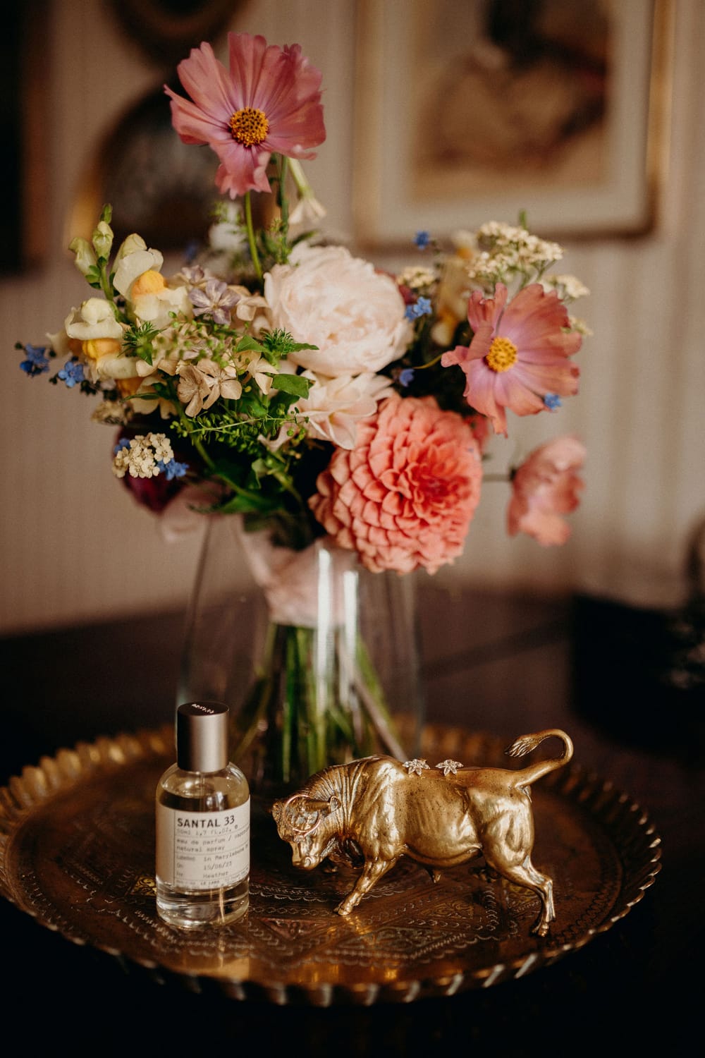 I wore a diamond, flower-shaped gold necklace I was given for my 21st birthday, along with Mejuri crystal petal earrings and diamond studs. Our gold wedding rings were from Taylor & Hart, who also made my pear-shaped engagement ring.
