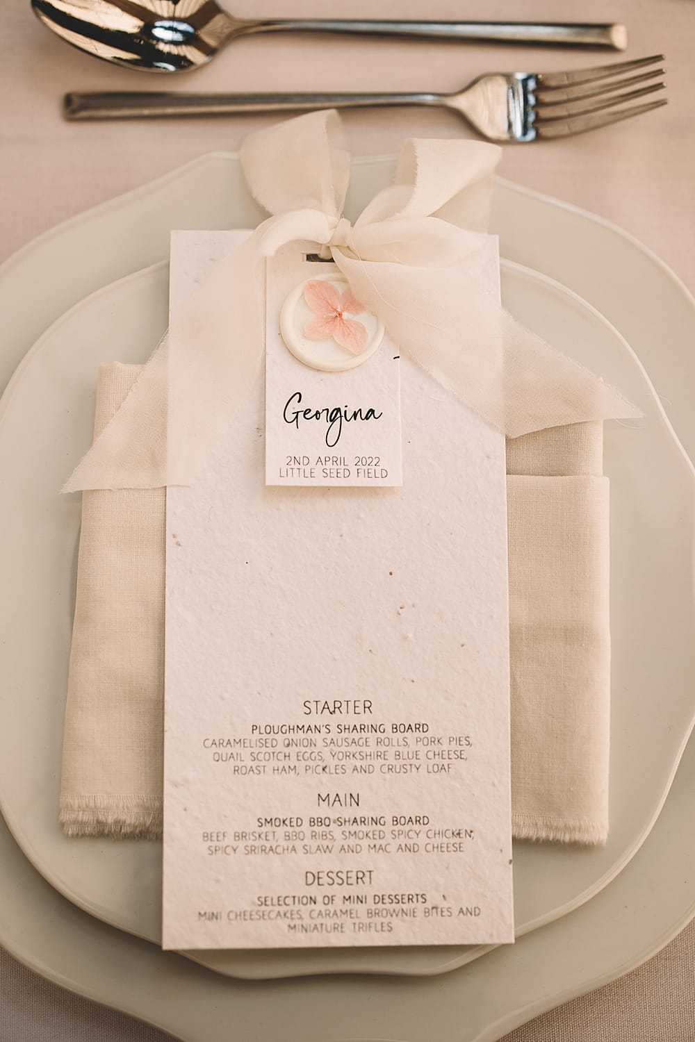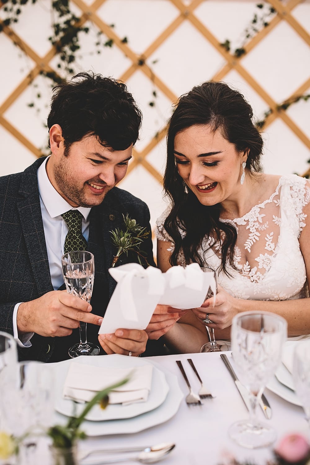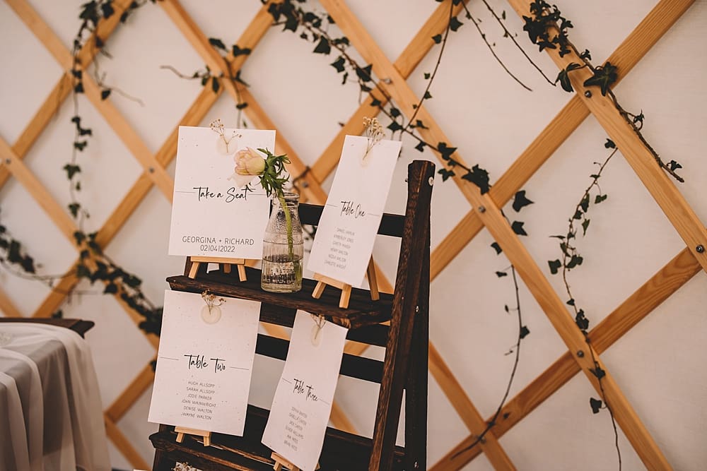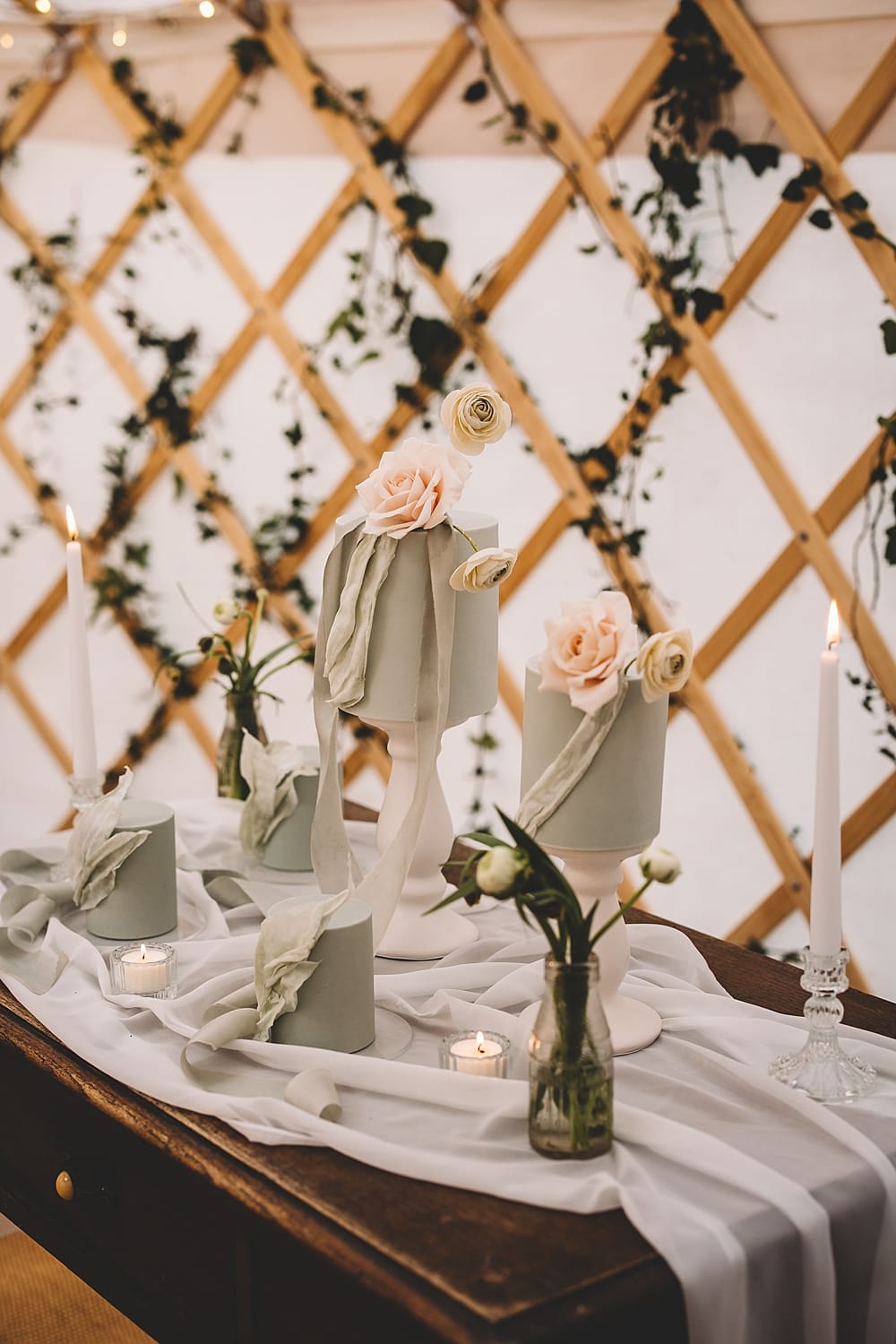 As The Owl Barn lends itself perfectly to outdoor weddings and elopements, our style was natural, seasonal and sustainable. Our intimate dining set up, created inside a yurt provided by North Sky Yurts, bridged the transition from outside to inside beautifully. Lattice styling, softened with trailing ivy blended beautifully with the woodland setting surrounding the site. We chose to keep the décor minimal but elegant to reflect the rural setting, opting to use hired cutlery, crockery and glassware, old milk bottles and ripped old cotton sheets to create the napkins. The finishing touch for the styling came in the form of the beautiful seed paper stationery from Hervé-Jones Designs. Our gorgeous sage mini cakes from Folia Cake Design were styled on a vintage wooden sideboard with the yurt’s lattice frame as a backdrop.