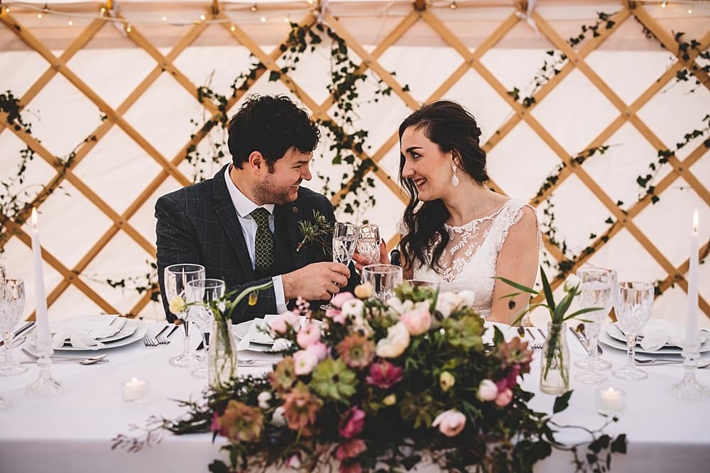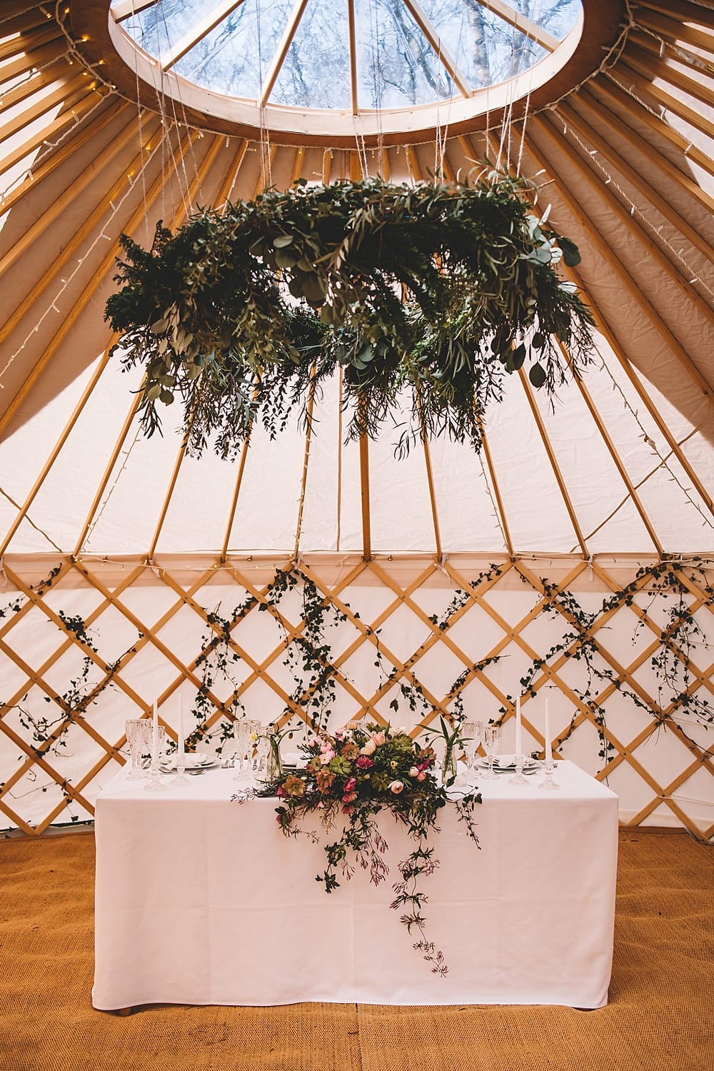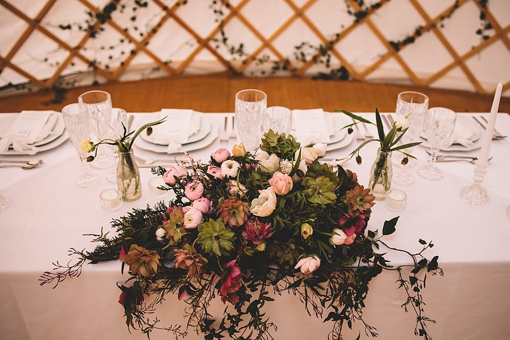 Rachel from Rose Cottage Barn used foraged foliage and sourced locally grown British blooms to help add a softness to The Owl Barn and the yurt. It was key that everything was proportionate, understated and natural. Creating an impact that matched and celebrated the surroundings.