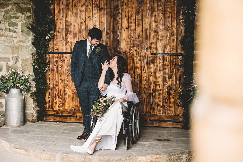 Everyone wants to feel like the best version of themselves on their wedding day and attire, hair and makeup can be a key factor in helping you to achieve this. We wanted to make sure that the outfits chosen were created using sustainably sourced and recycled materials, as well as being practical for Georgina to move around in when in her manual wheelchair or using her mobility aids. Miriam at Eliza May Atelier created a collection of outfits and accessories to meet Georgina’s requirements, seeking to complement her fun-loving and vibrant personality. Clare and Sarah kept Georgina’s makeup and hair soft and natural to match the setting. Laura at Haworth Menswear selected a grey 3-piece suit for Richard to wear, finishing the look with a green tie and pocket square which matched the foraged foliage used throughout.