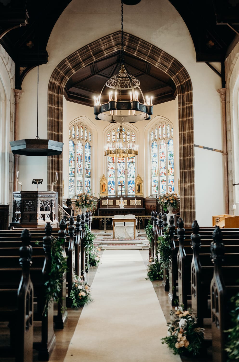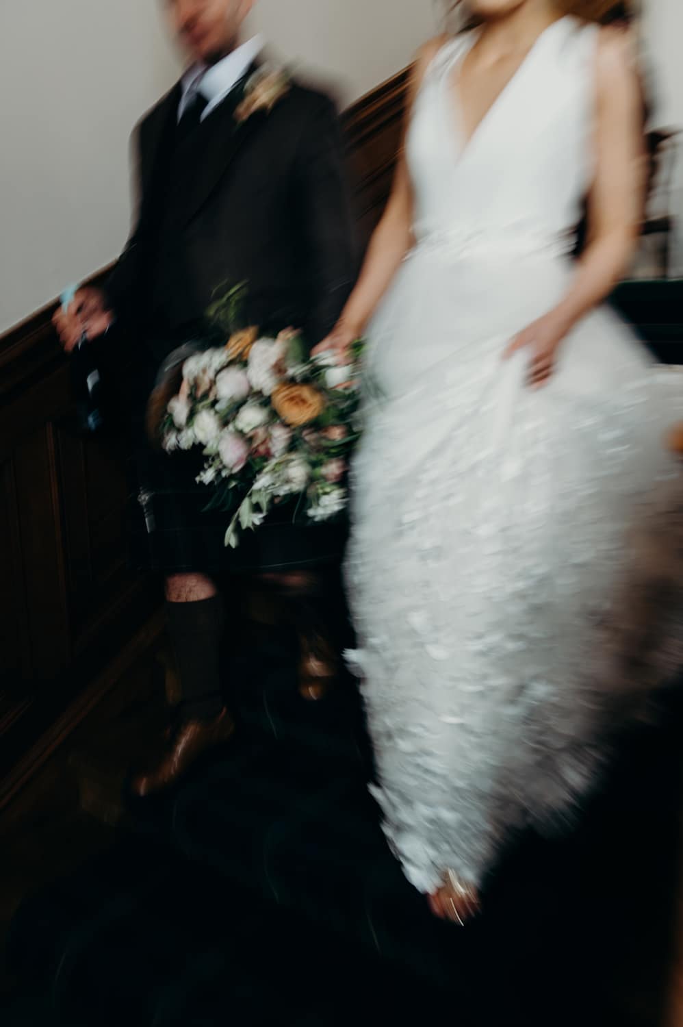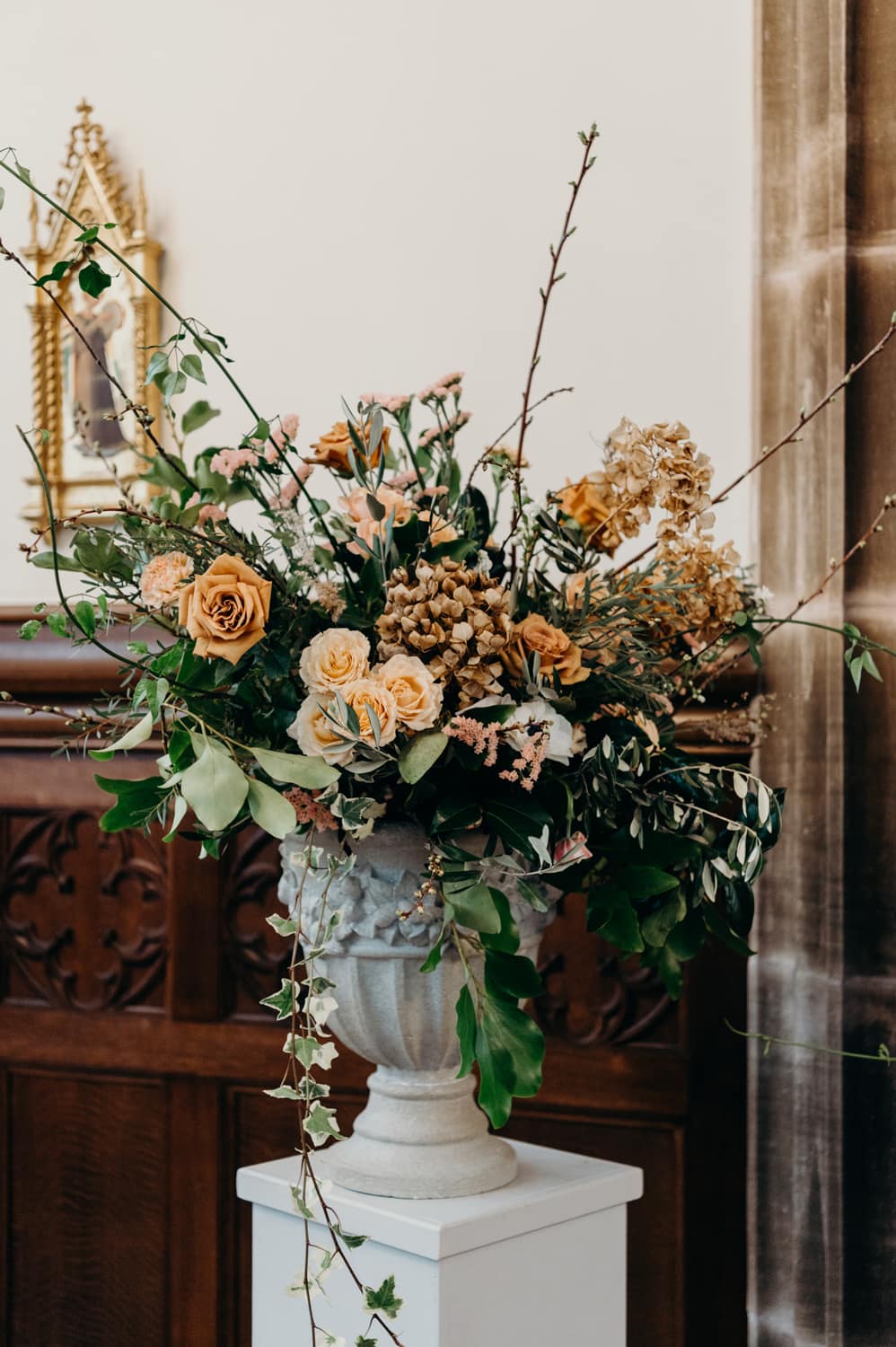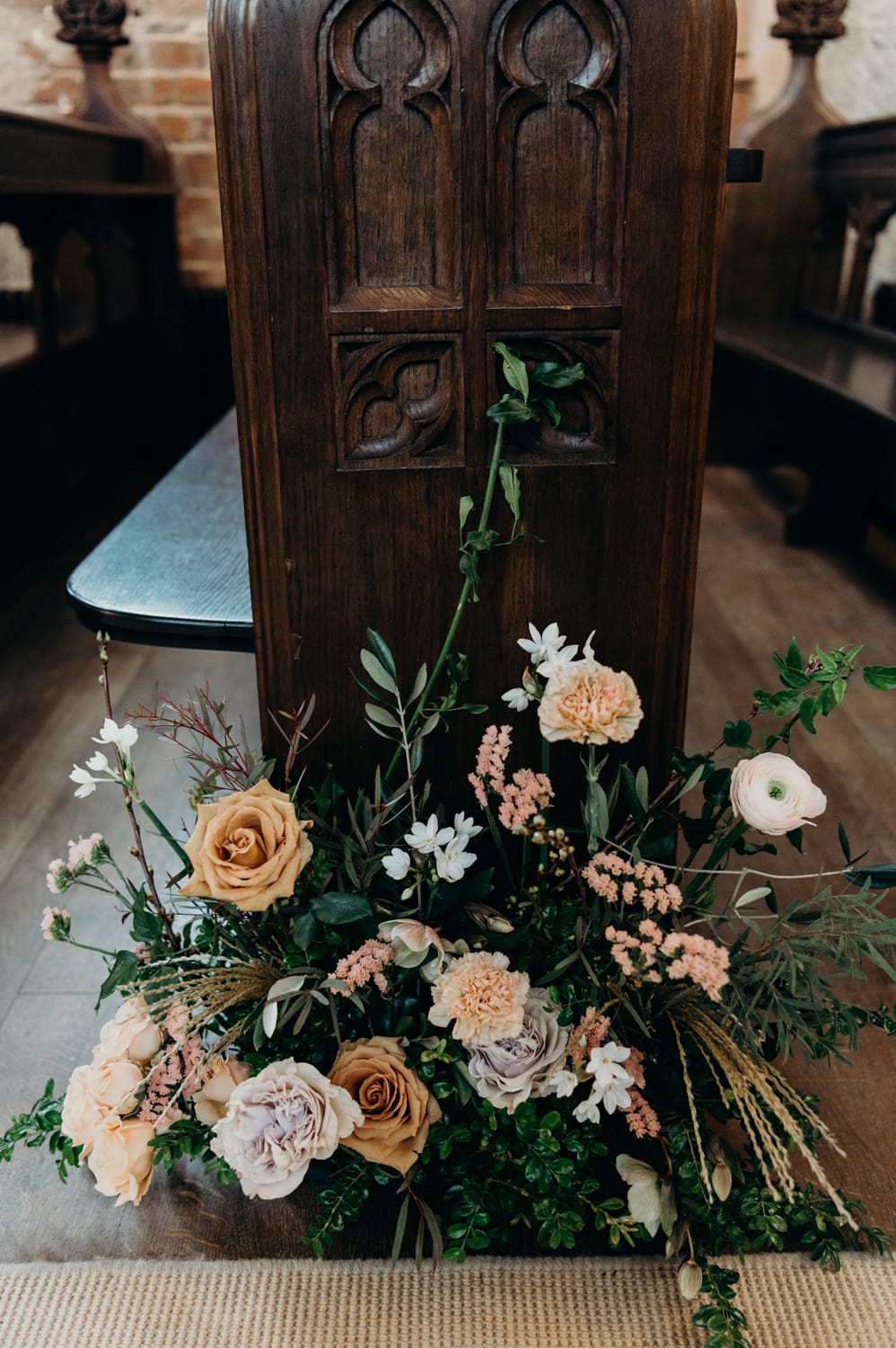 Lorna from Sakura Flowers says, “After meeting with Fiona at Cluny Castle, who gave me a brief, I put together a mood board to give an idea of colours and flowers we could use. Fiona was keen to incorporate rust and blush into the florals, so I started from there. The castle chapel itself is very decorative, so we decided to keep things classy and elegant here: giant urns at the altar with flowing tendrils of foliage and big blooms, and a combination of high soft pew ends and low mini flower meadows to line the aisle. The variation of height created the most beautiful effect.