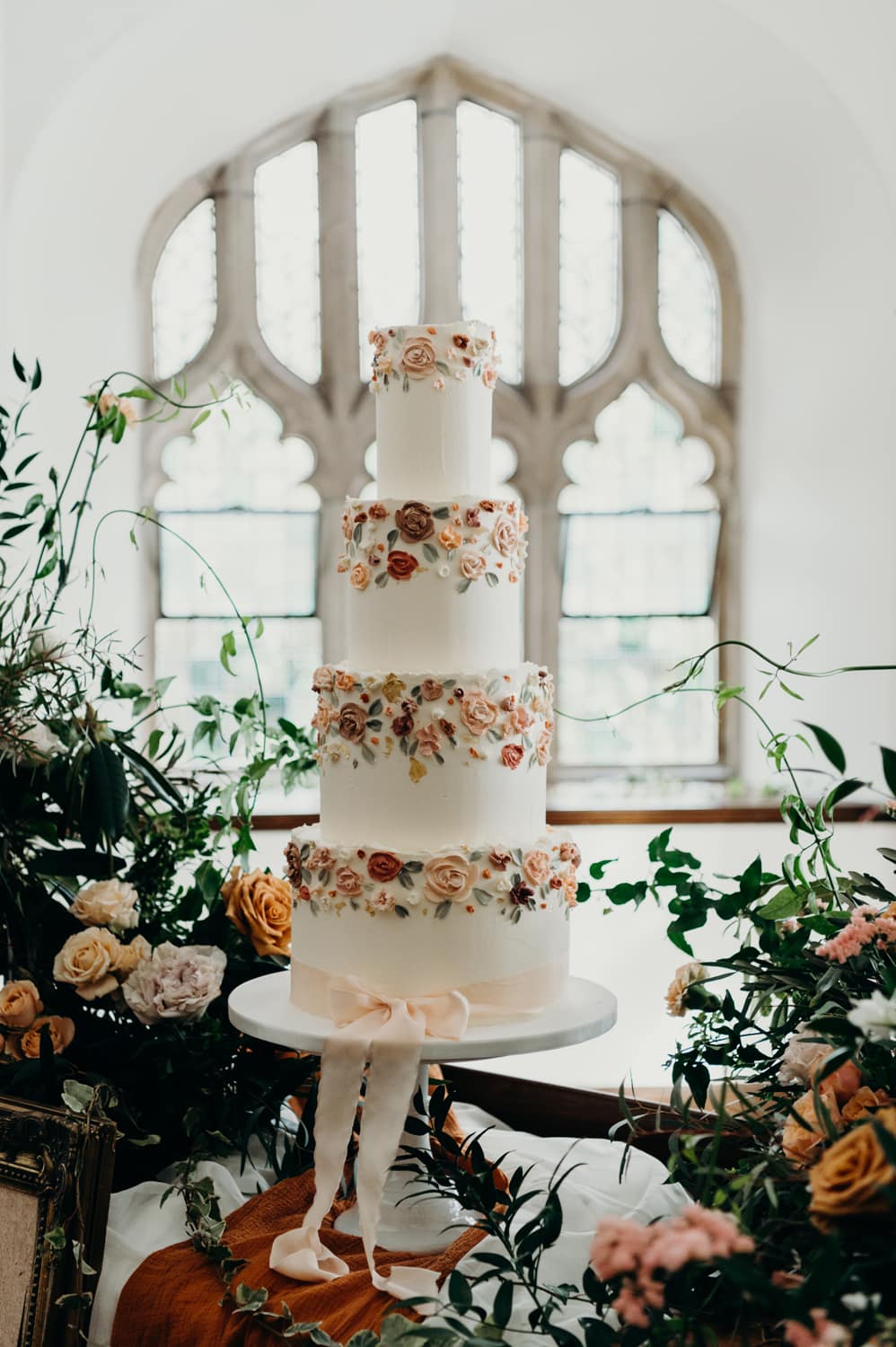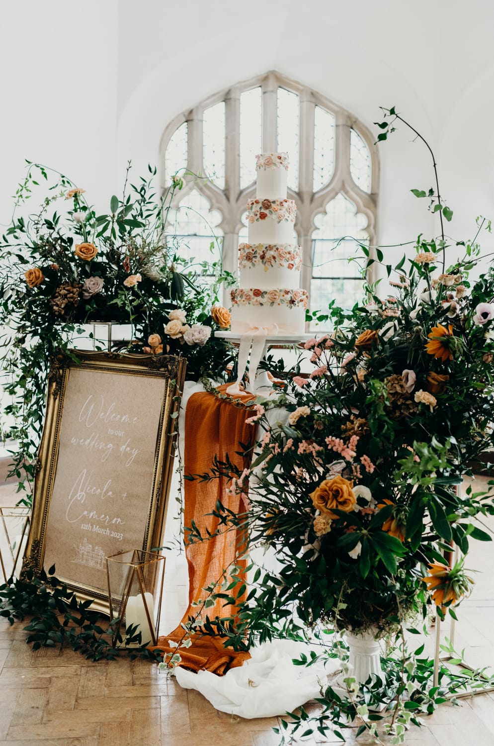 Down in the Tenants Hall, I worked alongside Tracey at Without a Hitch to create an overall light and airy feel, with lots of candles and multi-level floral centrepieces and used runners of terracotta to pull the colour scheme together. The cake area was designed to fully show off the beautiful cake made by Cakes by Kirsty. I used many florals at different heights to fill the space and make it a fundamental room feature. Cake cutting is a trend coming back this year, so we wanted to show how far you could go with this part of your wedding day. Although this was a predominantly autumnal colour scheme, I used lots of greenery and seasonal flowers to give a soft spring feel. All arrangements were made using sustainable friendly methods with no floral foam.”