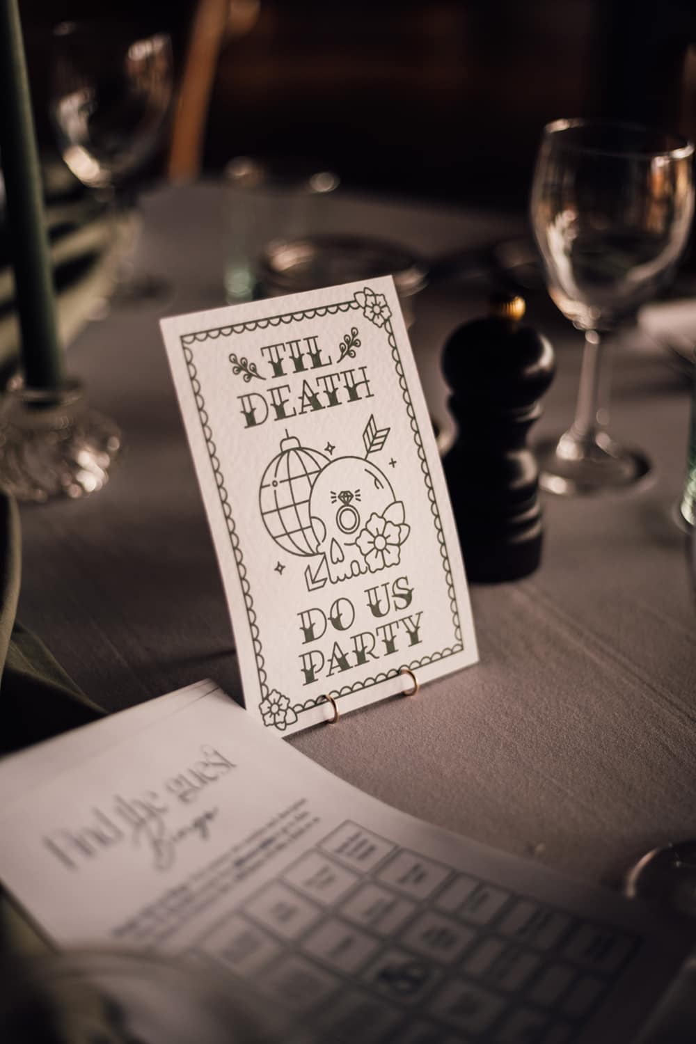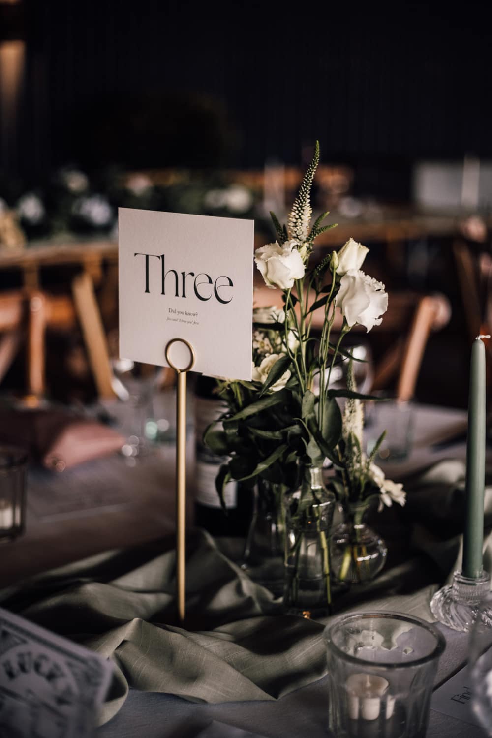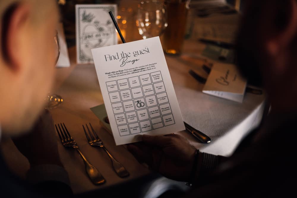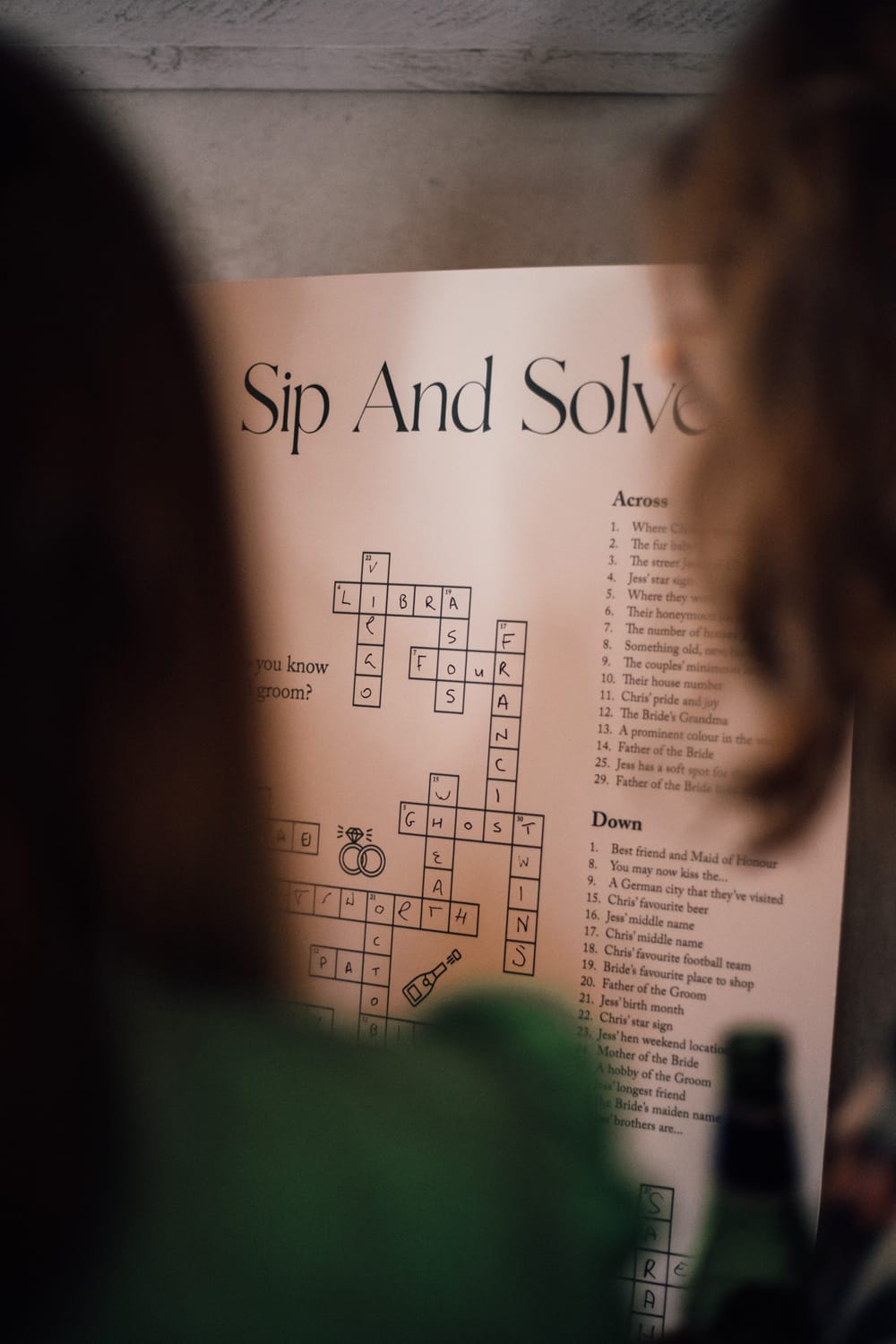 As a designer I took it upon myself to create all of the graphic elements for the day myself. Everything was very personal – I designed us a wedding logo that consisted of elements relating to us, the table numbers had facts on about us, we had a ‘find the guest’ bingo where guests won a drink if they got a full house, all of these were personalised to the guests attending our wedding. We even had a giant crossword that I had designed that consisted of questions about us as a couple for all of our guests to fill out.