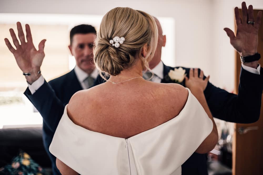 Comfort was key for me, so I opted for elegant slip-ons with a block heel and then swapped to converse with lace ribbons at night. A girl’s got to be comfy, right? To complete my bridal look, I opted for a pearl veil and other pearl accessories, all my jewellery was lovingly gifted by my mum from Lily & Roo. The touch of pearls added a timeless elegance to my overall look. The incredibly talented Amazing Grace took charge of my hair and makeup. Together, we decided on a sleek and sophisticated updo to perfectly complement my dress. It was a match made in heaven.