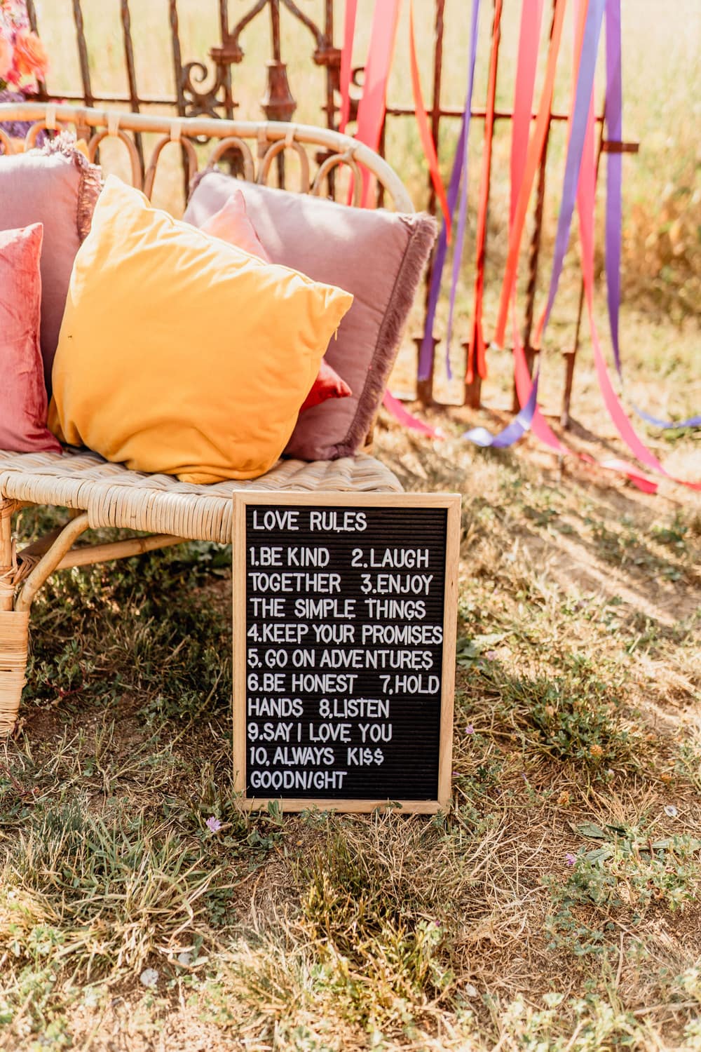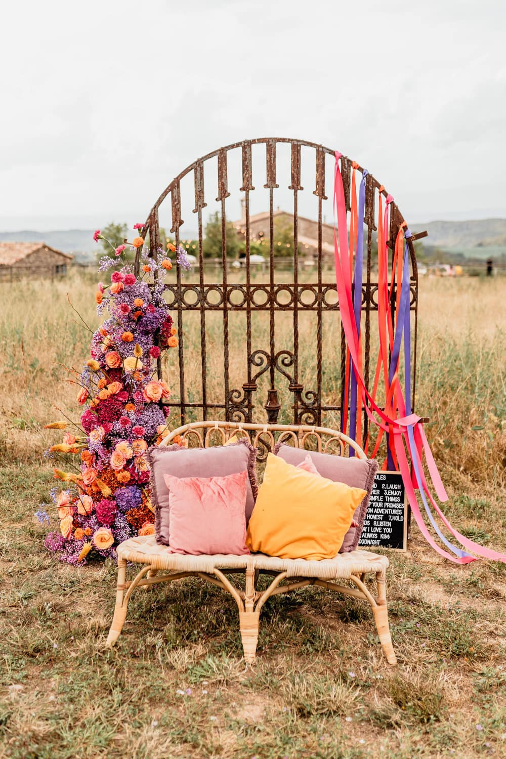 Other decor included ribbons used to compliment the flowers on the metal gate in the Paddock for the ceremony and inside the Graners (our barns) to decorate the balcony and stairs. Other than that, the decoration was achieved beautifully by our friends and family, who duly arrived resplendent in all the colours of the sunset themselves and with such lovely smiles on their faces.