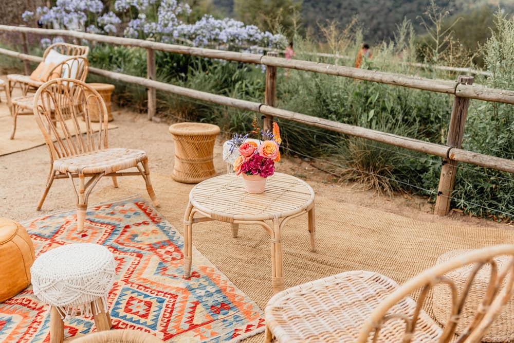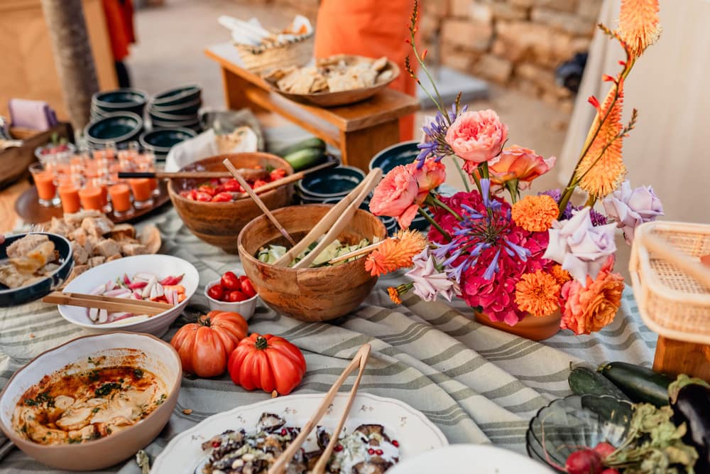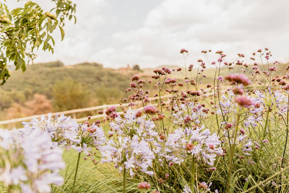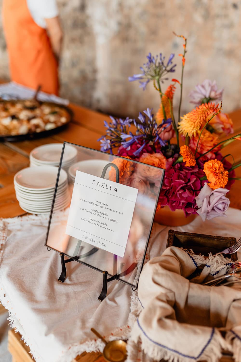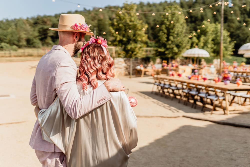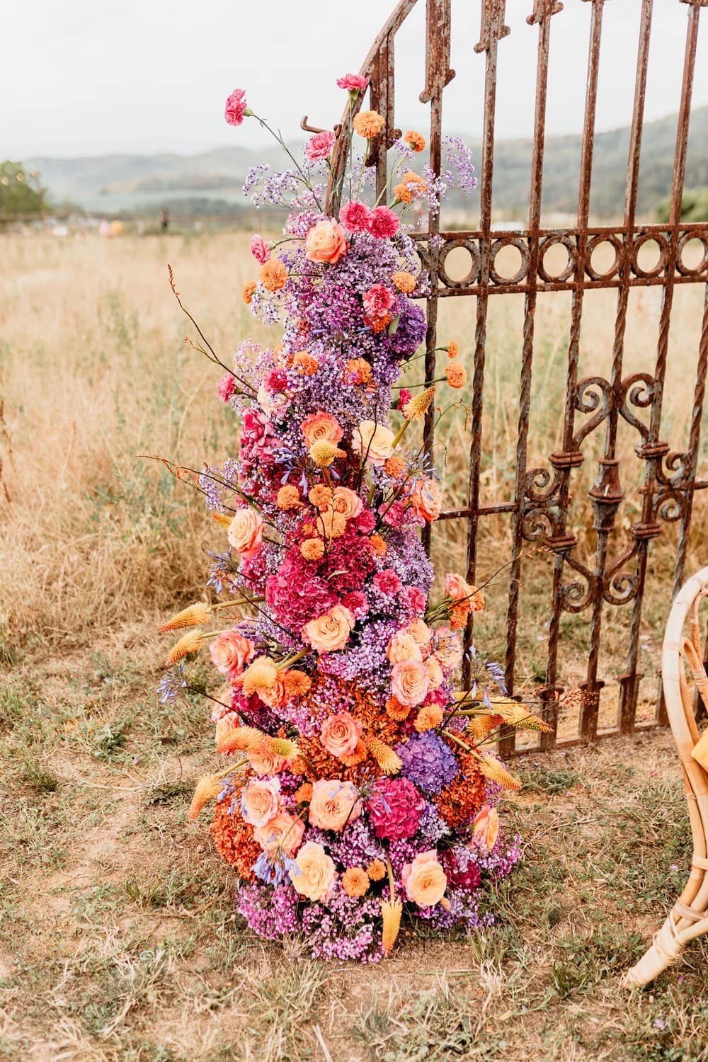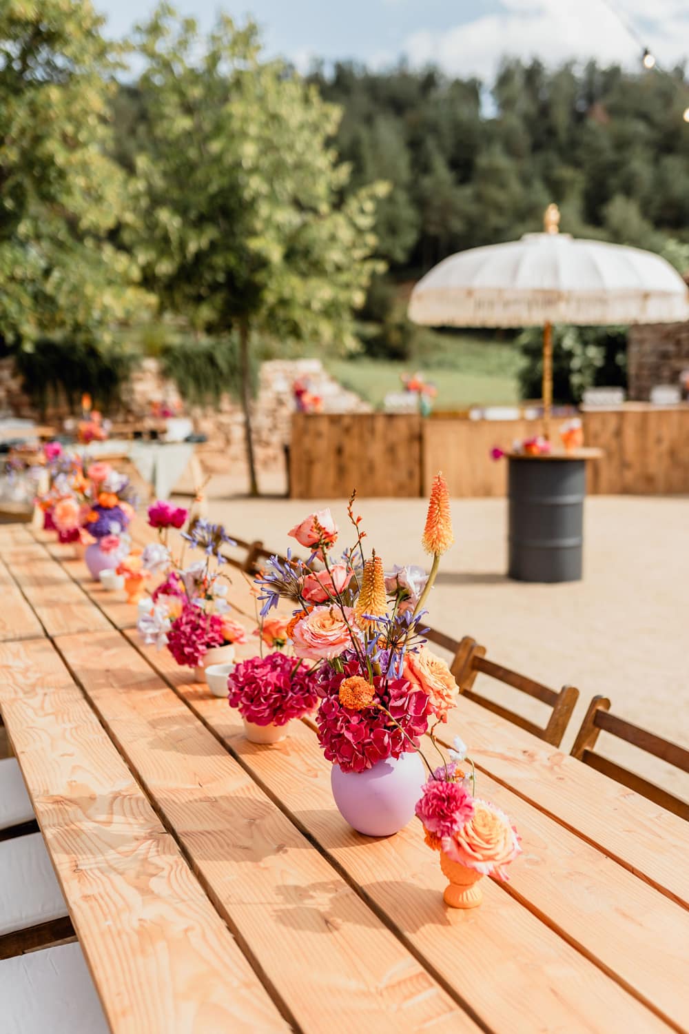 The ‘colours of the sunset’ theme carried through to the other styling of the day, with the flowers by Loreak being bold, fun, and playful. They featured some of our favourites, including Kniphofia and Agapanthus, which also feature prominently in our gardens… and in the tattoos of Jo’s arms!