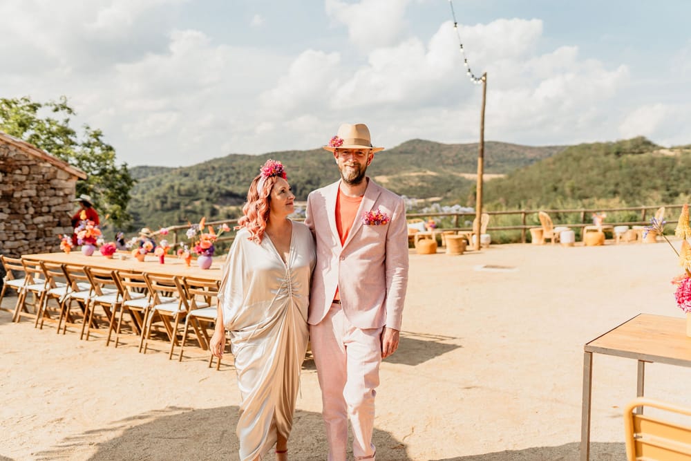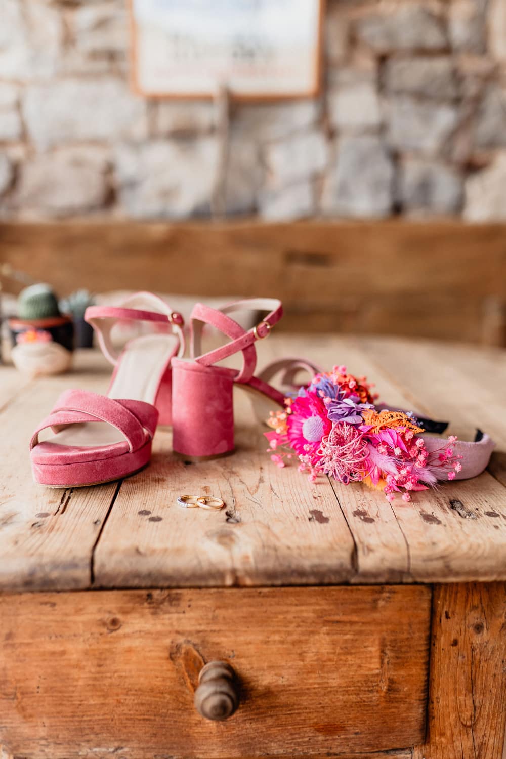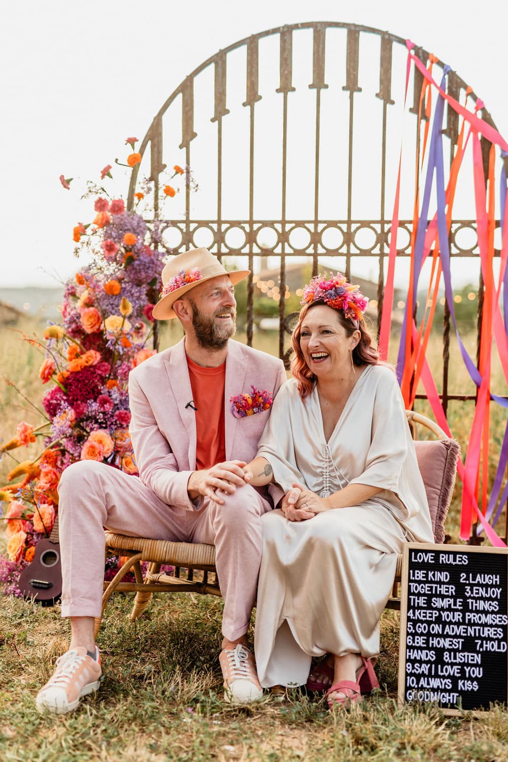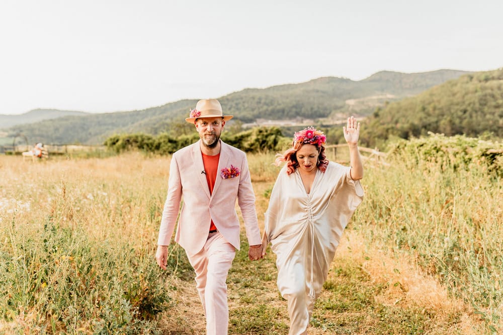 We followed these guidelines, too, with Jo sporting pink hair that was wonderfully styled by Laura from Bokeh and topped with an amazing dried flower crown made by the florist Loreak. She wore a fabulous non-traditional shimmering dress and custom-made heels from The Forest Shoes in Barcelona. Duncan wore a pale pink suit with a Loreak-created dried flower pocket, a burnt orange t-shirt by Folk Clothing and sunset-coloured Adidas trainers. Plus, a Panama hat adorned with another of Loreak’s marvellous dried flower creations.