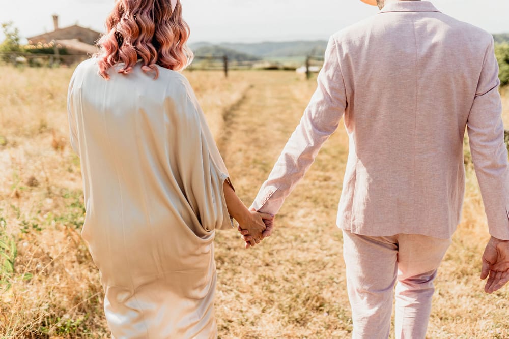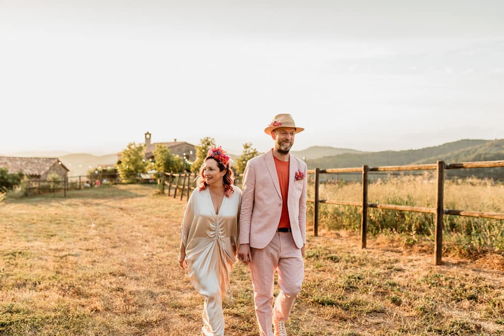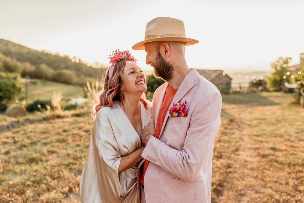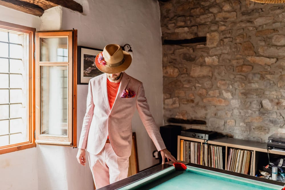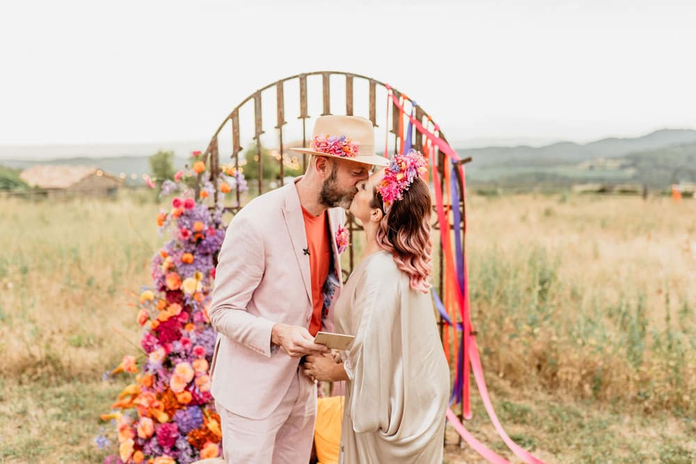 We followed these guidelines, too, with Jo sporting pink hair that was wonderfully styled by Laura from Bokeh and topped with an amazing dried flower crown made by the florist Loreak. She wore a fabulous non-traditional shimmering dress and custom-made heels from The Forest Shoes in Barcelona. Duncan wore a pale pink suit with a Loreak-created dried flower pocket, a burnt orange t-shirt by Folk Clothing and sunset-coloured Adidas trainers. Plus, a Panama hat adorned with another of Loreak’s marvellous dried flower creations.