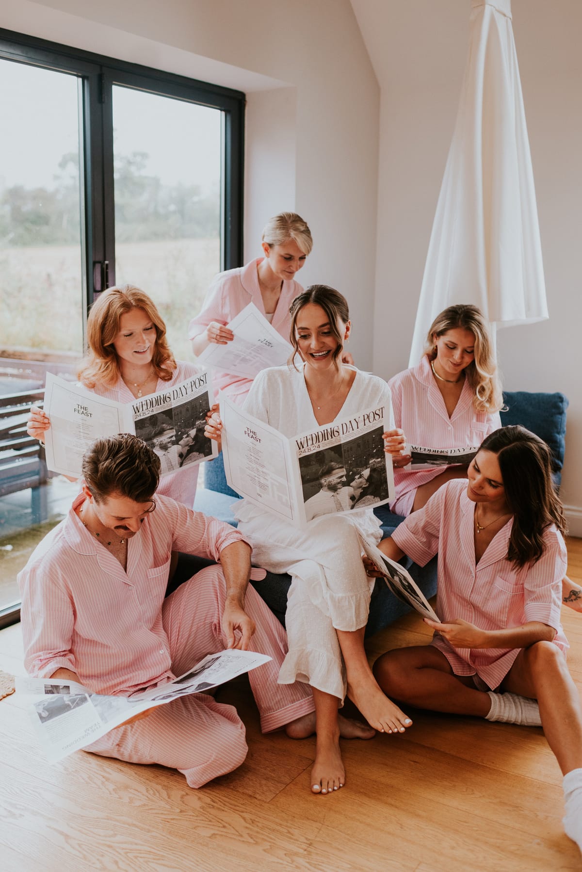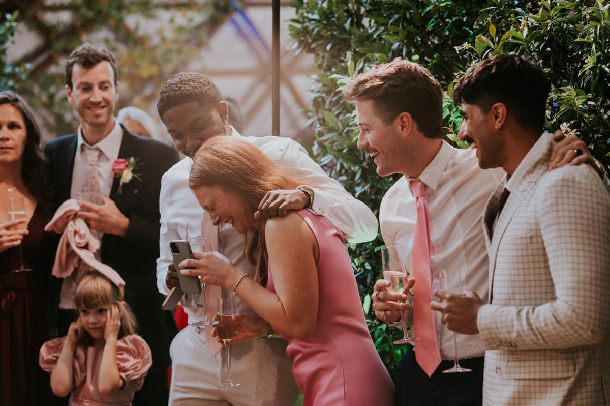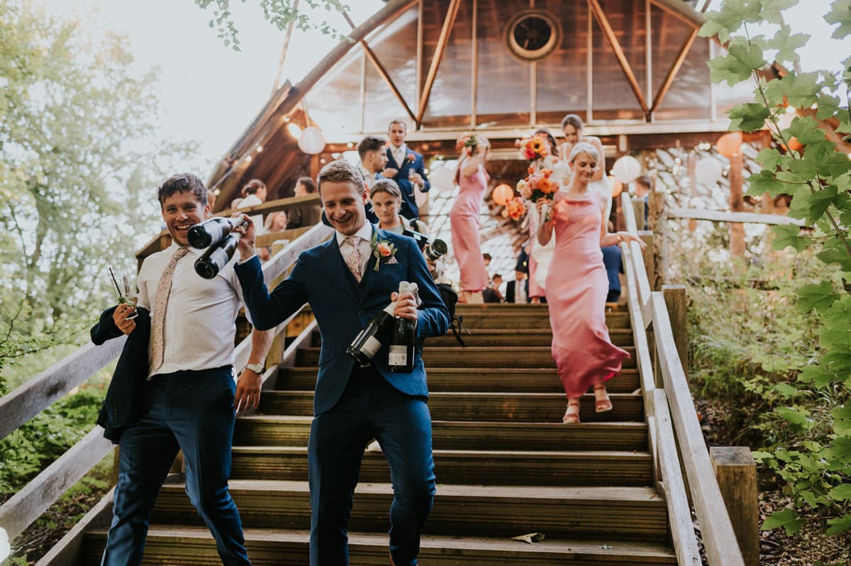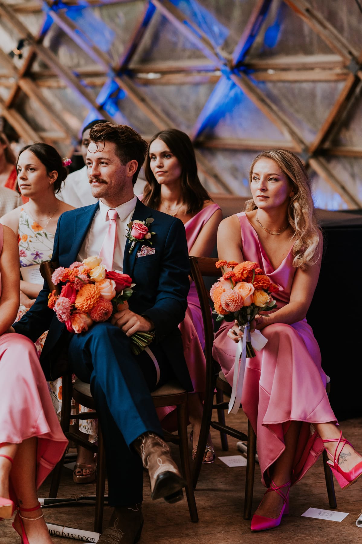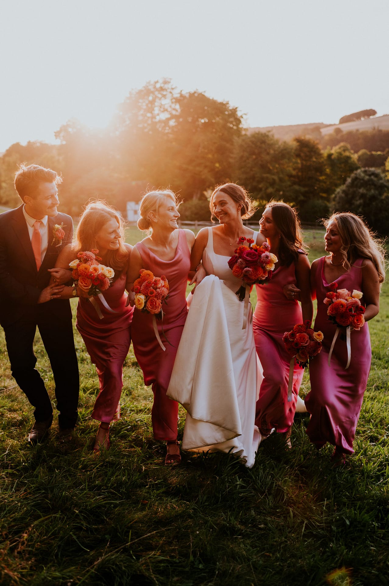 The bridesmaids wore Norma Kamali dresses, which we chose to be colourful and vibrant. We opted for pink to complement our colour palette, and the cowl neck shape was flattering on all of them. The bridal party’s hair and make-up was done by Emma Louise Bridal Hair and Bex Standing Smith, both of whom were fantastic and made us feel amazing. Couldn’t recommend them enough!
