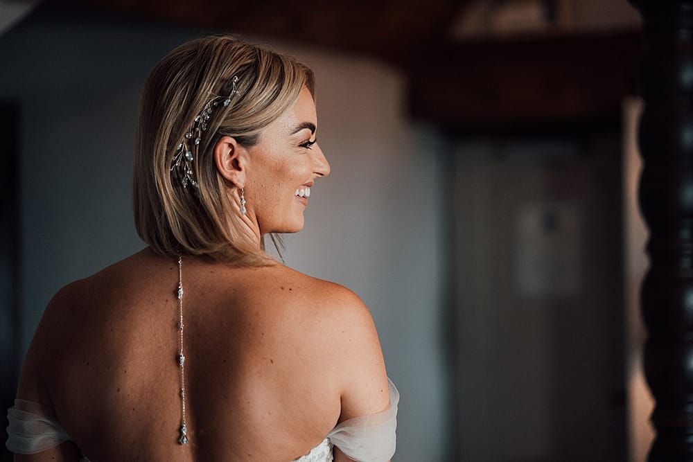 I actually went for a dress completely opposite to what I had envisaged. Originally I was thinking to go for a plain, elegant, and flowy dress, however, this didn’t suit me. The dress that I ended up choosing was the ‘Élysée Athénaïs’ which is very figure-enhancing, made up of lace with soft tulle and has off the shoulder sleeves. I opted for ivory and nude colouring to match the colour theme of the day. And for the bridesmaids, we knew from the beginning that we were going for a dusky rose colour. As all of my five bridesmaids are different shapes and sizes, it was a perfect choice to go with a multiway dress that they could all wear comfortably and in whichever style they chose, we had an extra piece of tulle fabric attached to the bridesmaids’ dresses so that they matched with my dress also.
