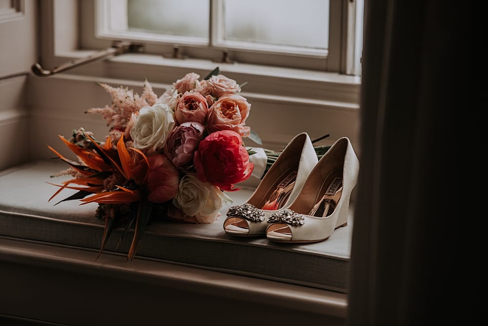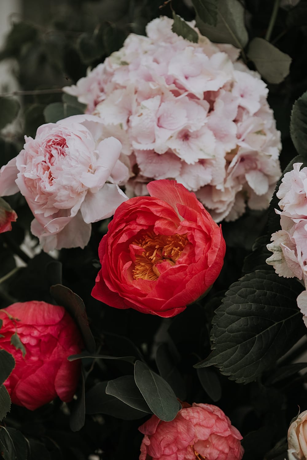 We were really blessed to have Melissa, our décor stylist, since she is also a florist by trade. Pennsylvania Castle has a beautiful garden and flowers throughout the estate. Melissa complemented the estate flowers with an arch full of roses and peonies around the pagoda. She also created a spread of hydrangeas and roses in pale pinks across the top table and arrangements of delphiniums in white, and pale pink roses and peonies on each guest table. Again – wanting to honour my Godmother, I picked her favourite flower ‘birds of paradise’ to accent my bouquet, the maid of honour’s (my sister) bouquet, and my mom’s corsage.