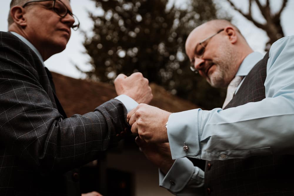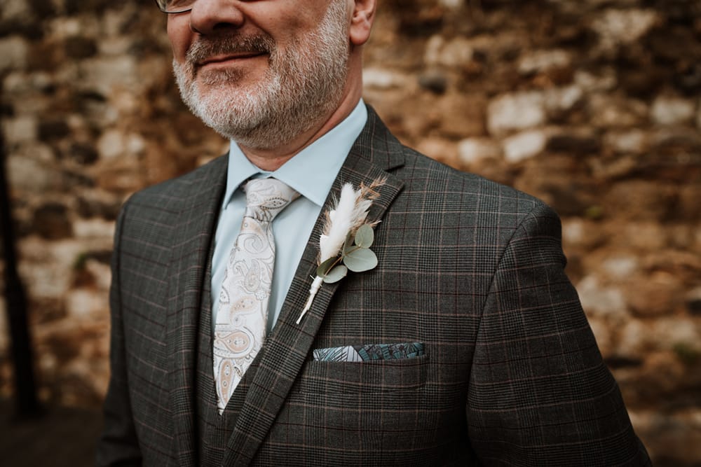Tony chose a grey checked suit with brown shoes, something comfortable but also suited the rustic nature of the venue. We wanted the men to all be comfortable so they chose their own suits that they could wear again – a dark blue check to complement the groom.