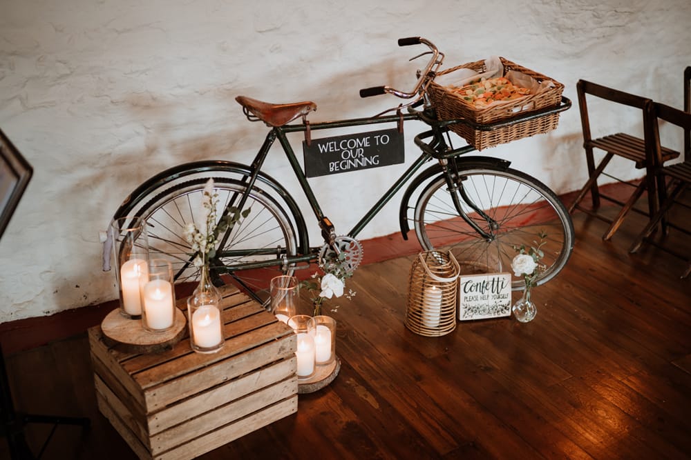 We didn’t really have a wedding theme but knew we wanted it to be relaxed, rustic and not too ‘pretty’. The brilliant Locate to Create helped with our styling and picked out some amazing pieces such as wicker lanterns, candles, brass candlesticks, wooden boxes and even an old fashioned bike to hold our confetti. We didn’t have a colour theme either but actually, after choosing all the pieces we liked, there was a lot of natural textures and colours.