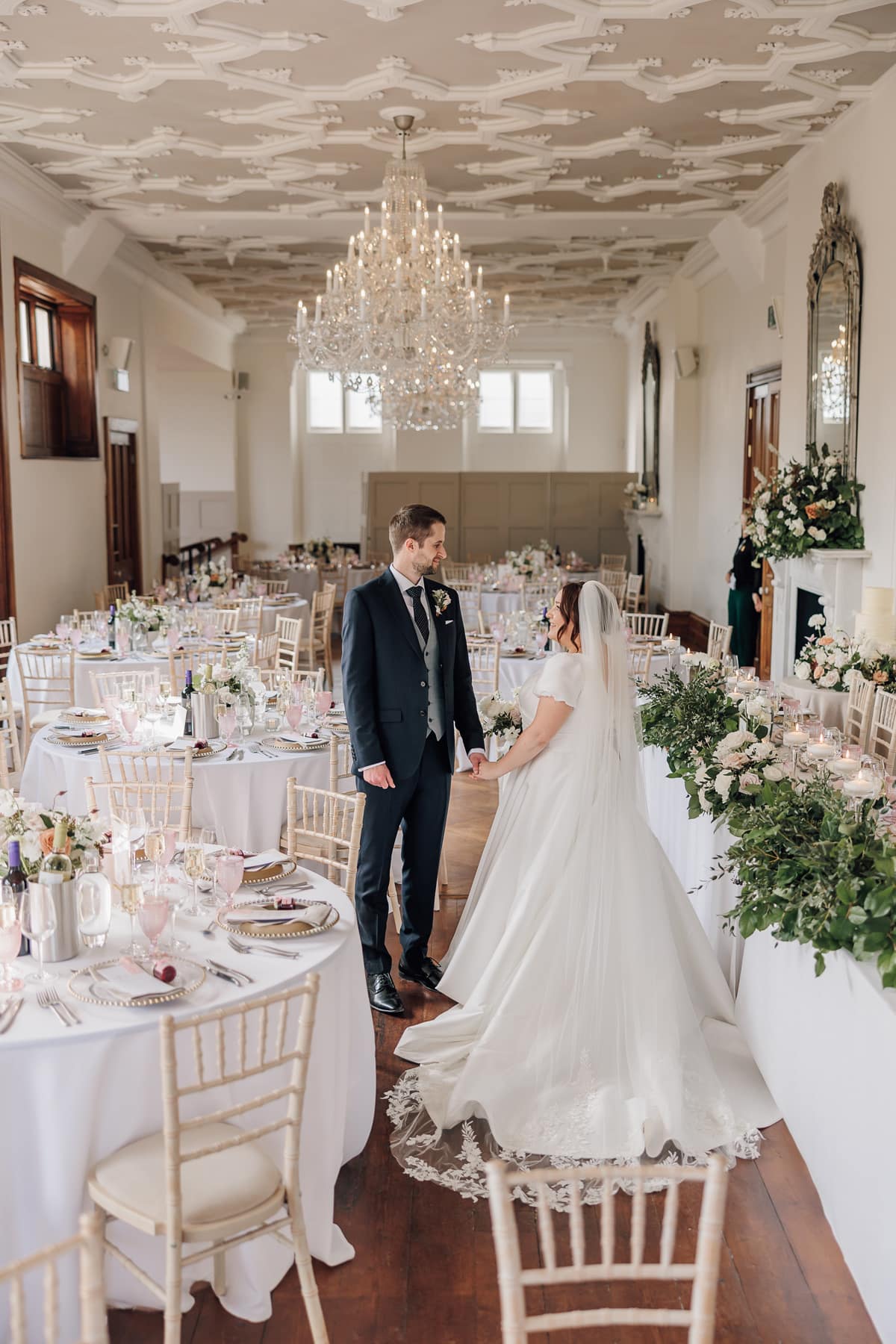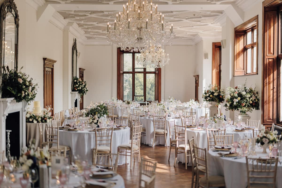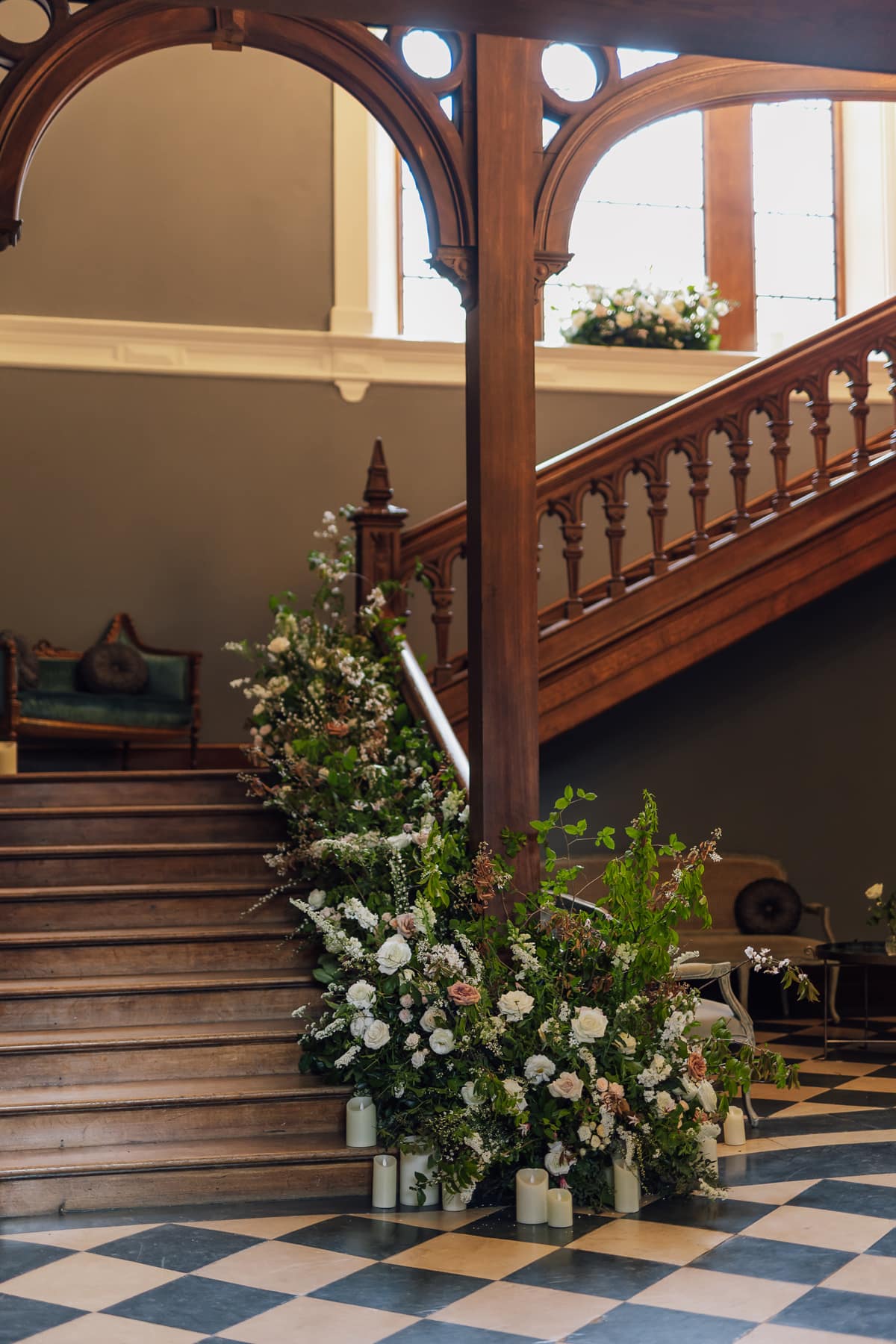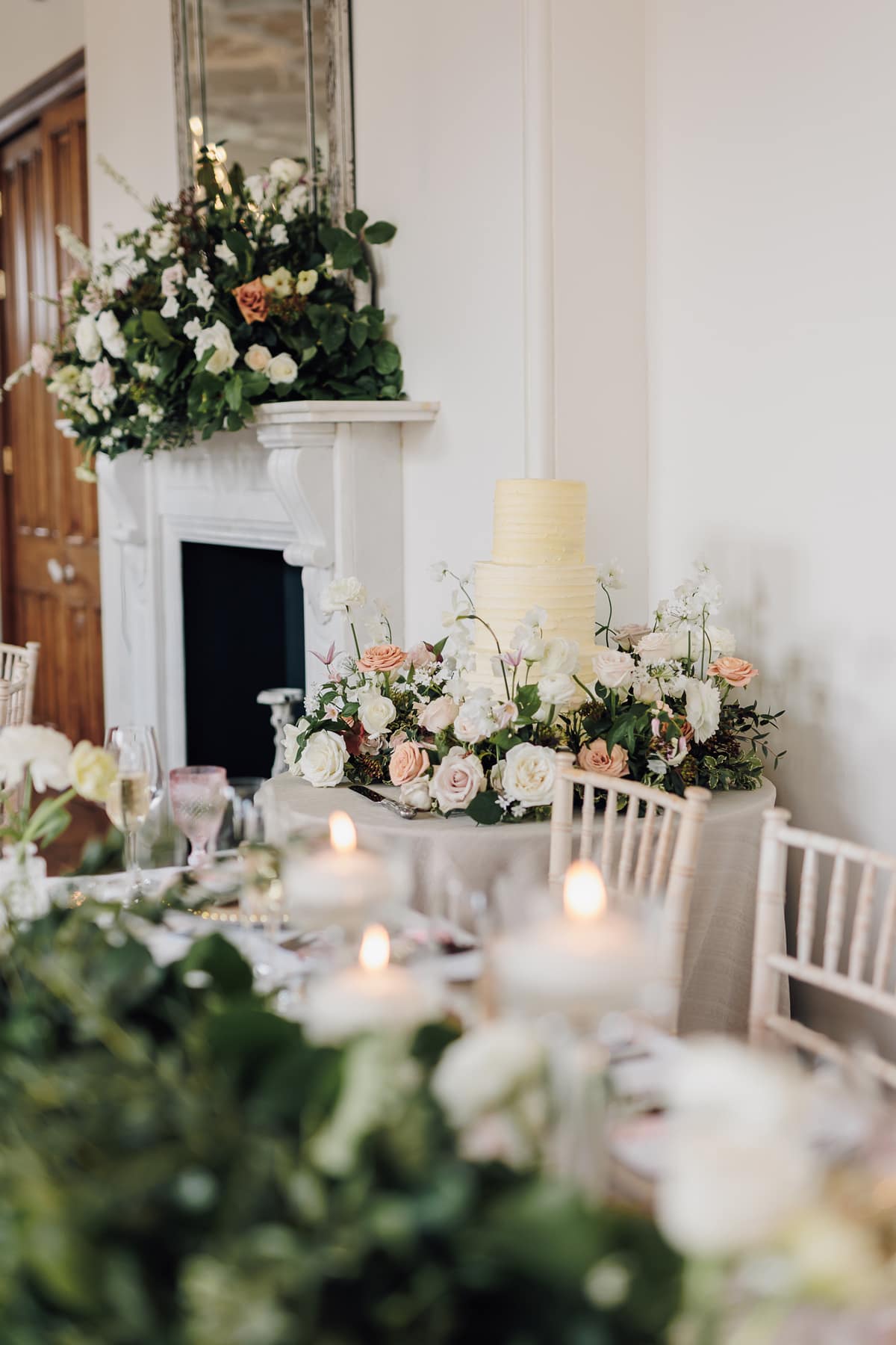 We chose statement arrangements for the fireplace in the morning room during our ceremony and on the grand staircase. Two large Bridgerton-style arrangements sat on columns in the entrance to the ceremony, and small arrangements sat in bowls in the centre of each table at the wedding breakfast. The top table had an additional arrangement which stretched across the front of the table, with bud vases nestled between the candles.