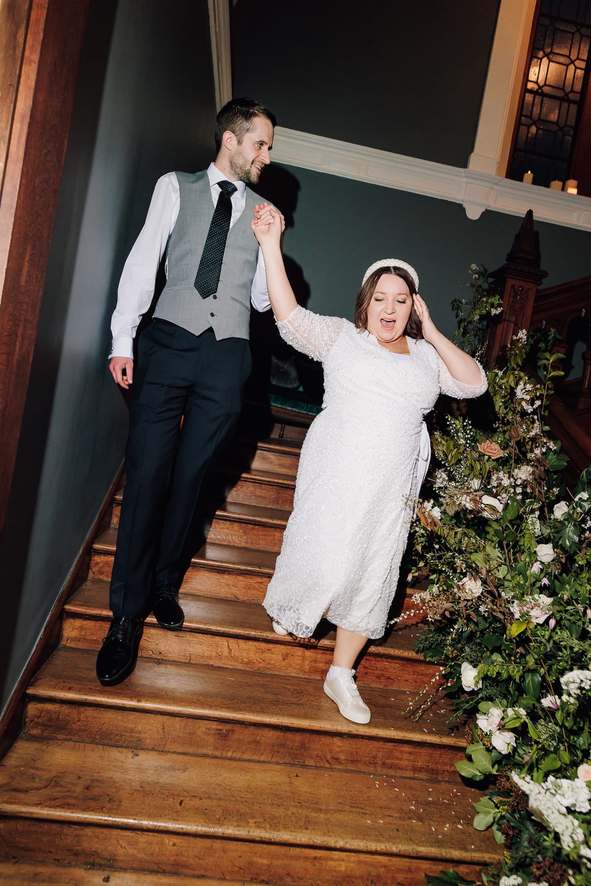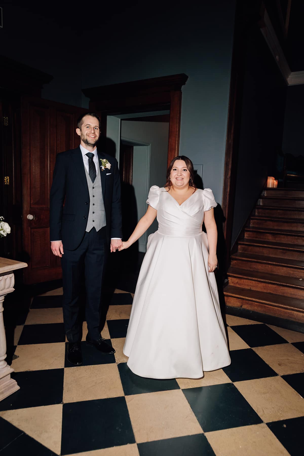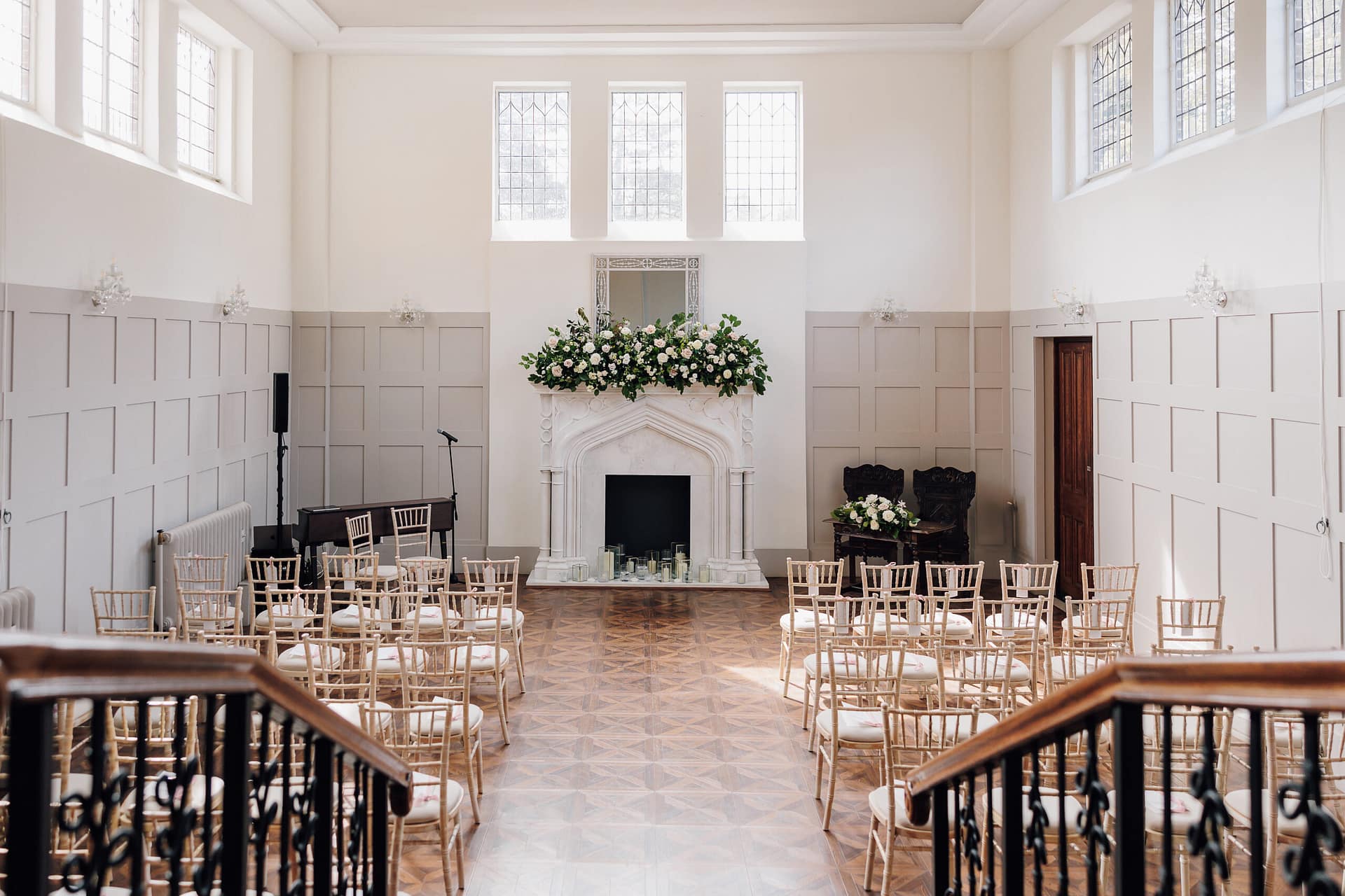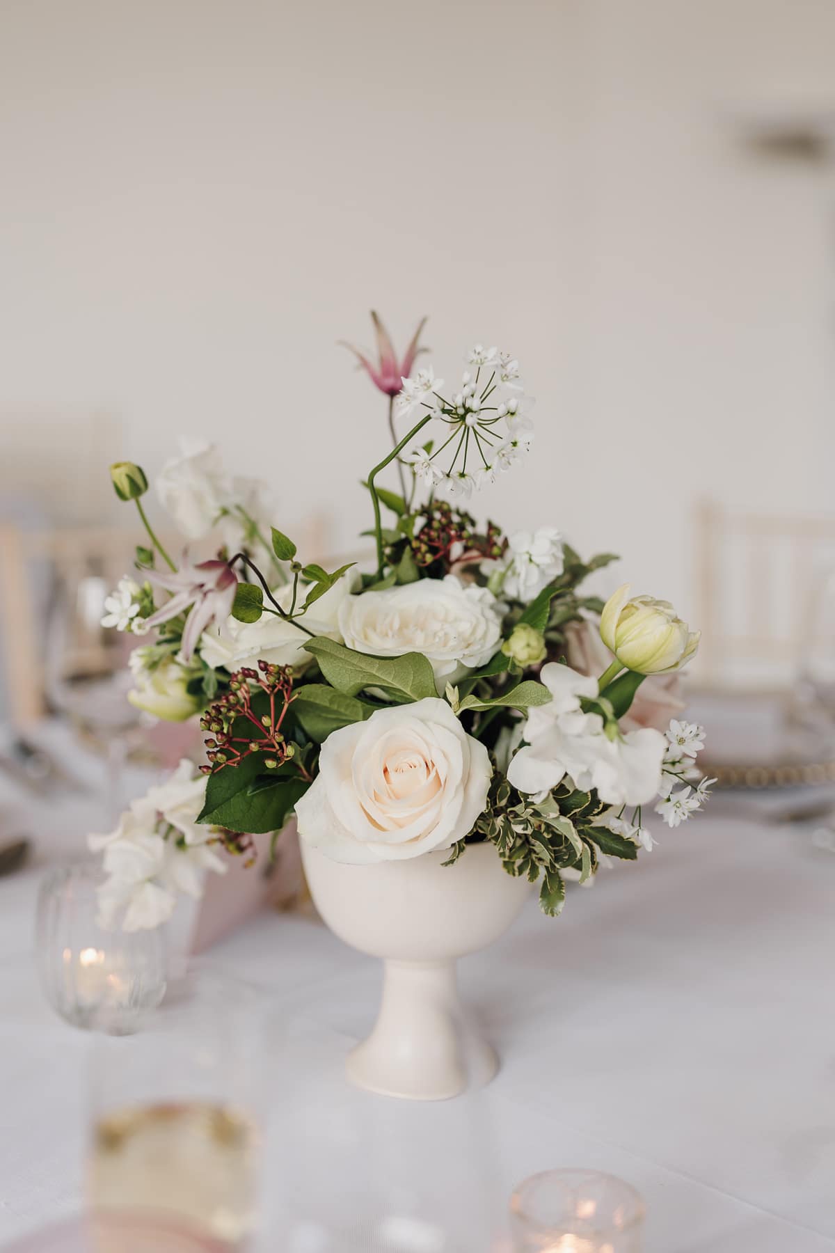 We chose statement arrangements for the fireplace in the morning room during our ceremony and on the grand staircase. Two large Bridgerton-style arrangements sat on columns in the entrance to the ceremony, and small arrangements sat in bowls in the centre of each table at the wedding breakfast. The top table had an additional arrangement which stretched across the front of the table, with bud vases nestled between the candles.