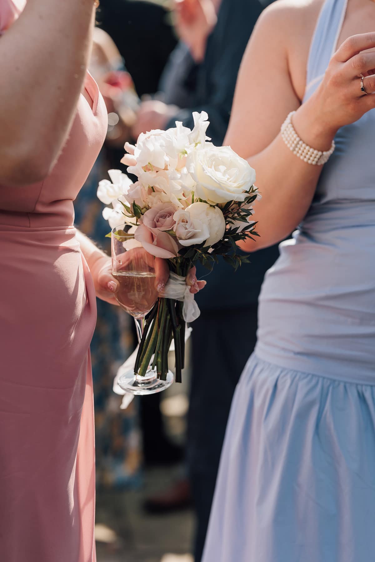 The florals featured ivory, blush, and caramel tones, paired with silvery green foliage. They incorporated seasonal ingredients such as ranunculus, blossoms, snaps, lisianthus, and larkspur, alongside a generous selection of classic roses. The bridal party bouquets were mid-sized, classical, loose, round and unstructured.