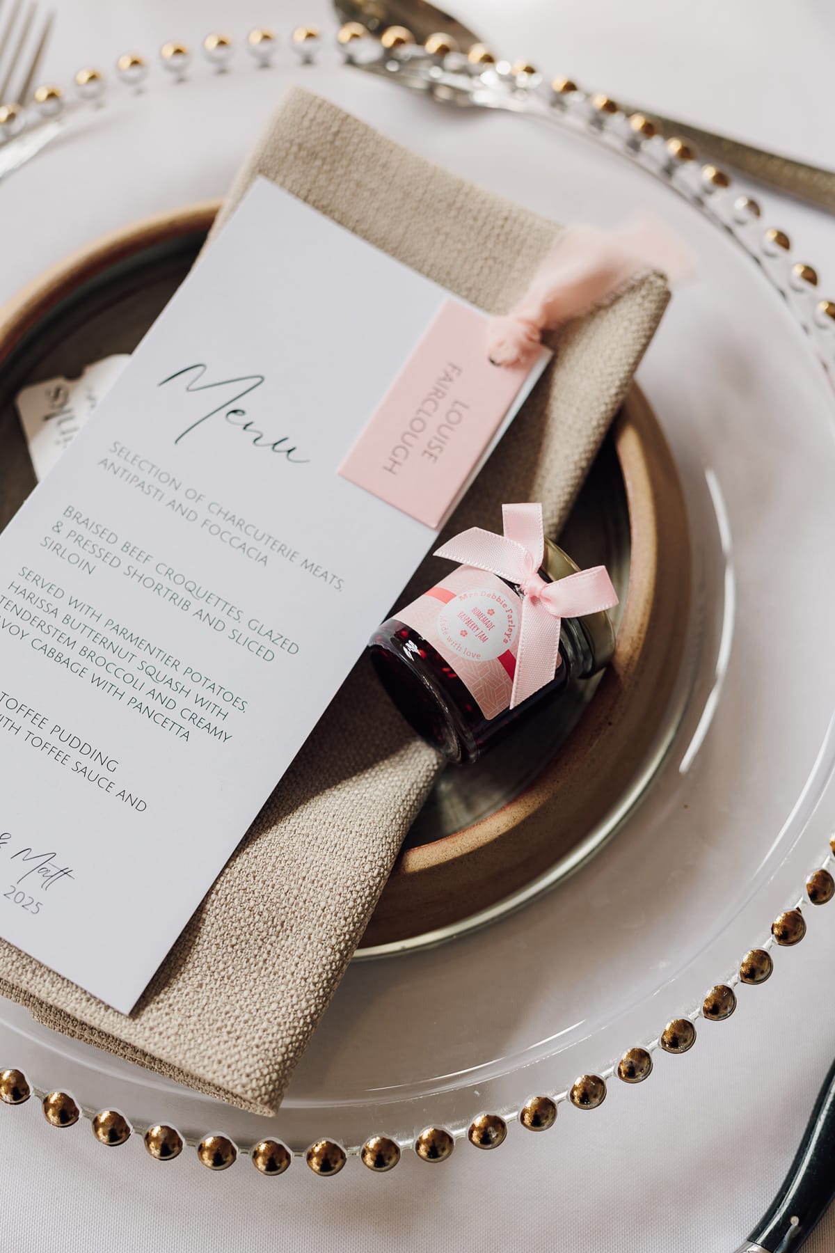 We added some personal touches to the décor too – personalised blush pink cocktail stirrers were put into our signature cocktails, a handmade wooden box by the groom’s friend Mike served as a card box, and framed photos of us as children and their parents and grandparents on their wedding days were placed around the bar. Matt’s mum, Debbie, made her signature homemade raspberry jam, which was placed in gold lidded, personalised mini jam jars on each guest’s plate to serve as favours.