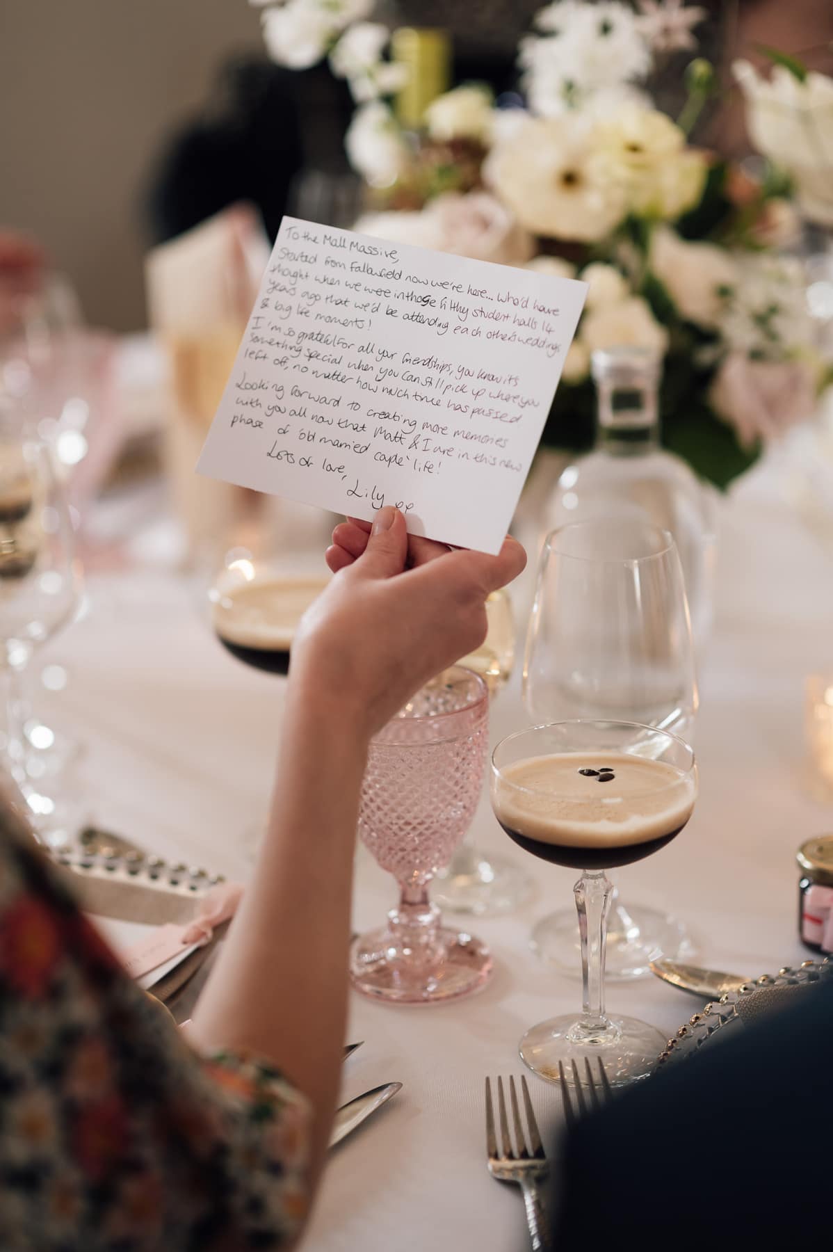 The florals and colours for the wedding were muted pinks, creams and neutrals with hints of gold. The venue stylists were Ambience Venue Styling North Yorkshire, who supplied gold-rimmed charger plates, white tablecloths, and oat-coloured napkins for the tables, along with a selection of gold tealight and floating candle holders. They also decorated the base of the fireplace in the ceremony room with candles. They created a mirrored seating plan for the wedding breakfast with a line from Taylor Swift’s ‘Lover’; ‘At every table, I’ll save you a seat…’, as I’m a die-hard Swiftie!