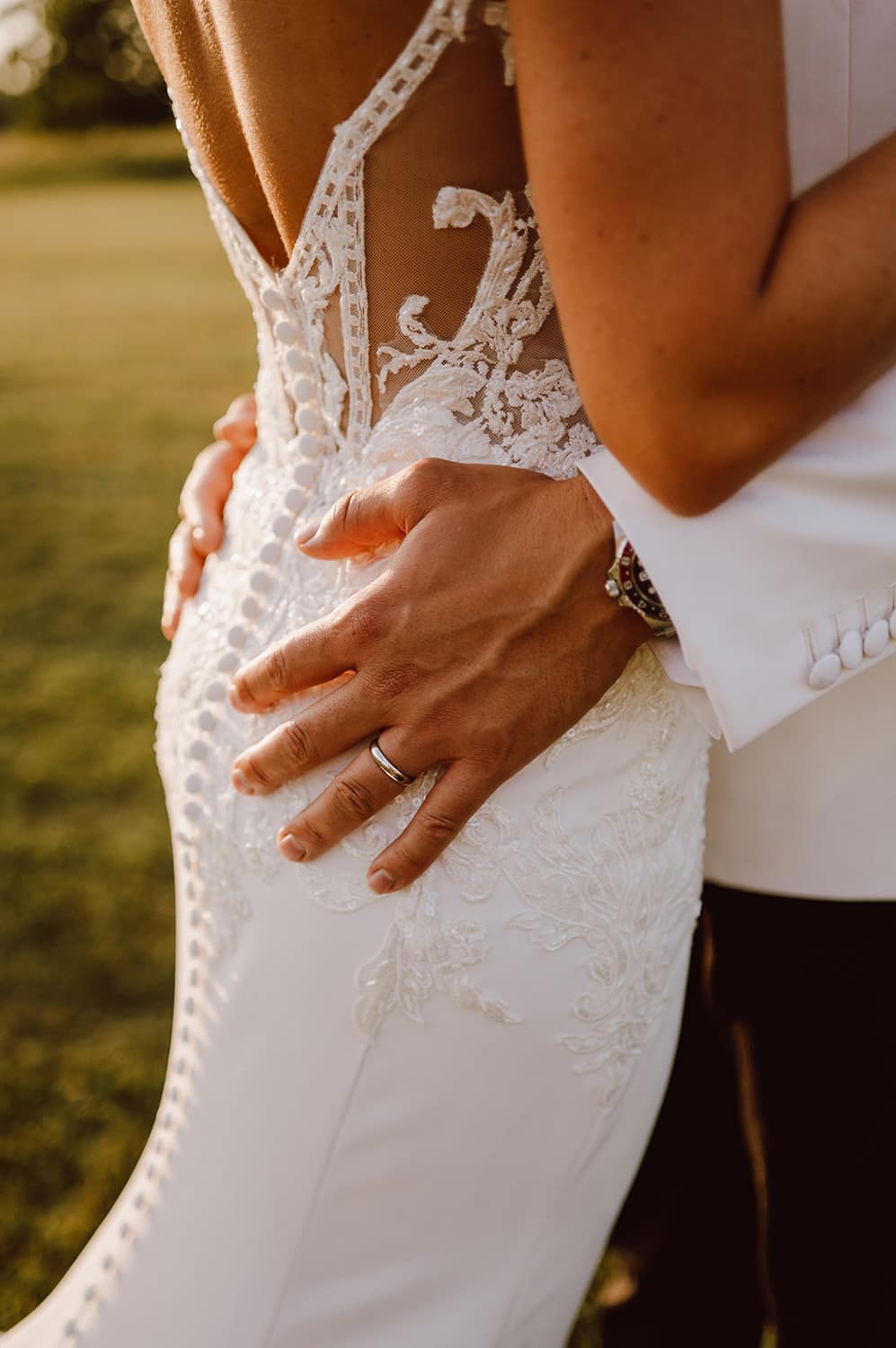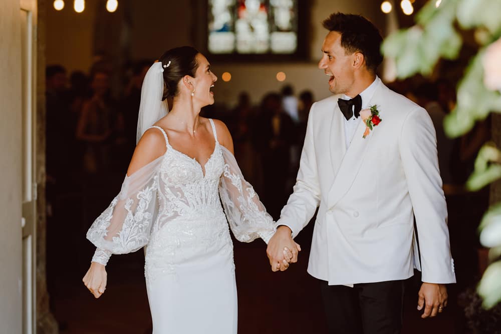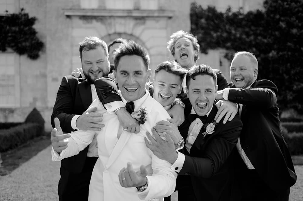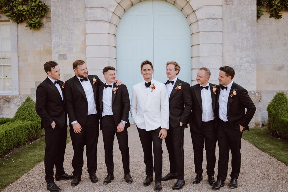 Lucy wore a stunning fitted dress by Martina Liana, which was both modern and timeless, featuring intricate hand-placed beadwork with lace. It fitted Lucy to perfection. Seb and the groomsmen wore black tie, with exquisite suits by the brilliant tailor Butch 1956. The fashion was Hollywood glamour through and through!