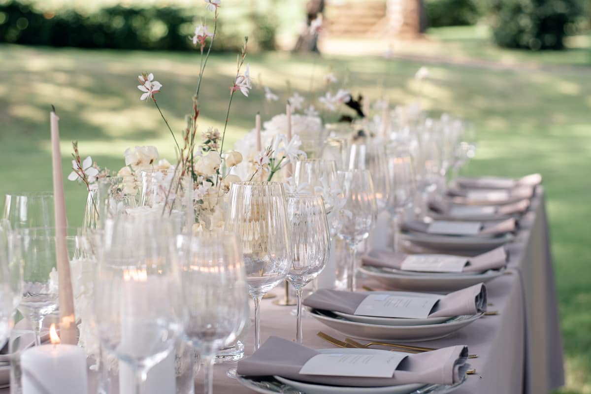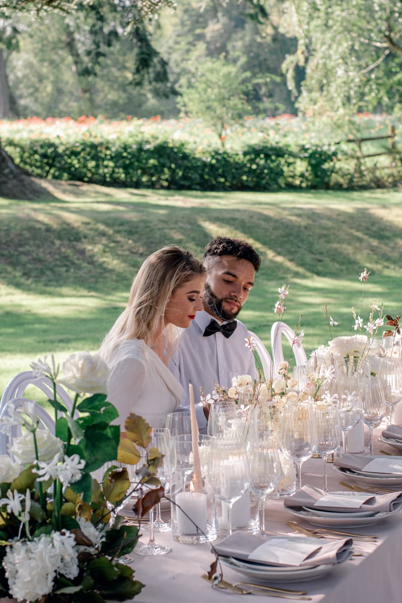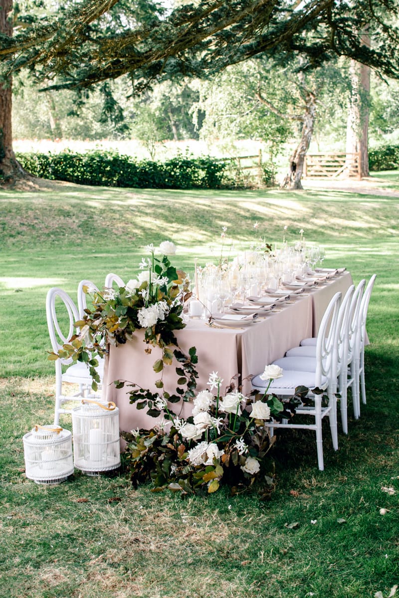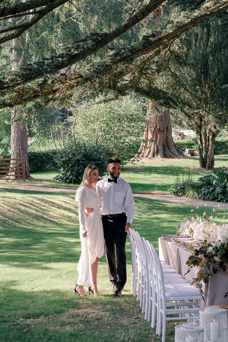 If you’re planning a beautiful country house wedding, deciding to hold your wedding breakfast or party outside if the weather allows means you can create a completely new atmospheric setting within your venue. With the right styling and decor choices this shoot demonstrates that it can also be done in a luxurious but modern way.