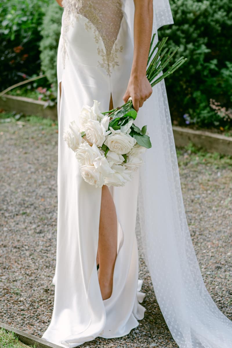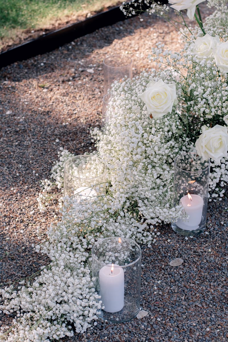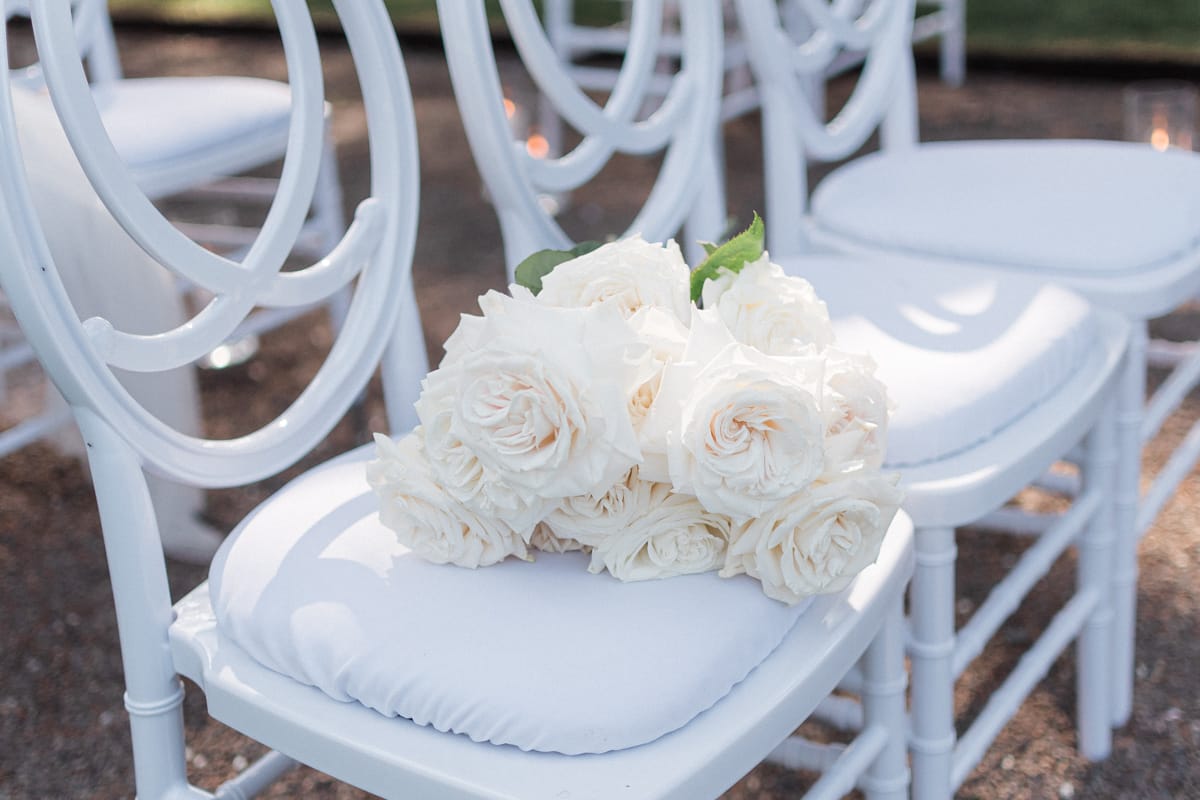 Liberty Lane Flowers created a beautiful floral arch from clouds of white gypsophila, white garden roses and iridescent lunaria. This stylish floral theme continued through to the al fresco wedding breakfast table. The simple white tones created a high end luxury feel, with the roses bringing in a classic touch.