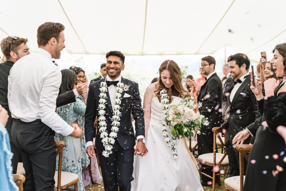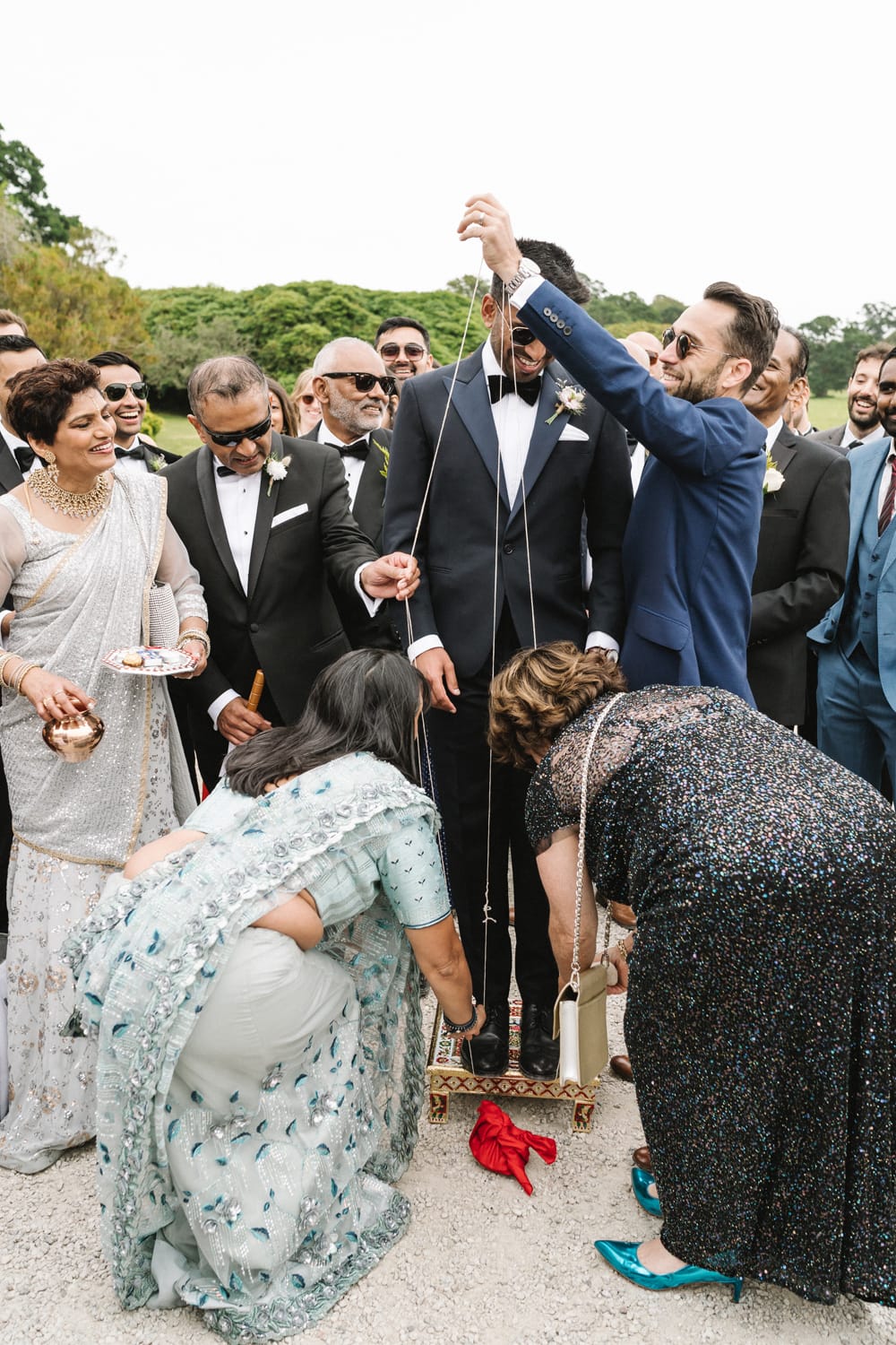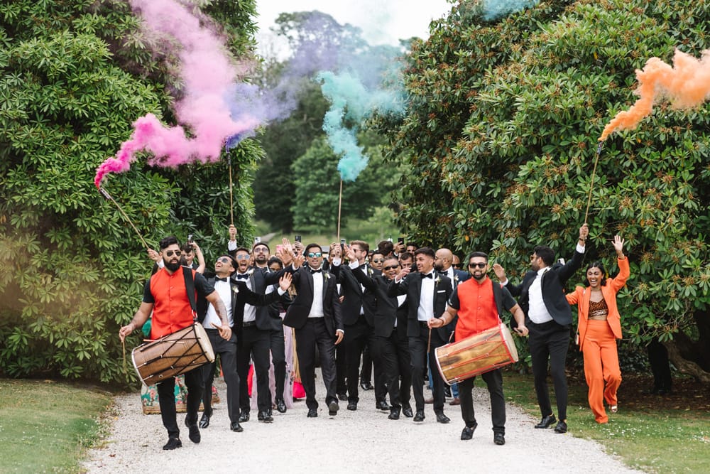 Before the wedding, I asked our guests to throw out the word “normal” as it often leads to comparisons and expectations. I wanted our wedding to feel unique and reflective of us. Our celebration was a fusion of our cultures, with our being raised in relaxed households with some traditional values. Mayur was raised in Hinduism and I Judaism. We aimed to represent our families at the wedding while staying true to ourselves. I wrote our wedding ceremony and discovered that both religions shared many commonalities. We incorporated practices that resonated with us and created a beautiful blend. For those who had never experienced an Indian wedding, Mayur’s colourful Bharat (groom’s entrance) was a highlight that is still talked about. Boconnoc’s driveway was the perfect setting for such an epic entrance!